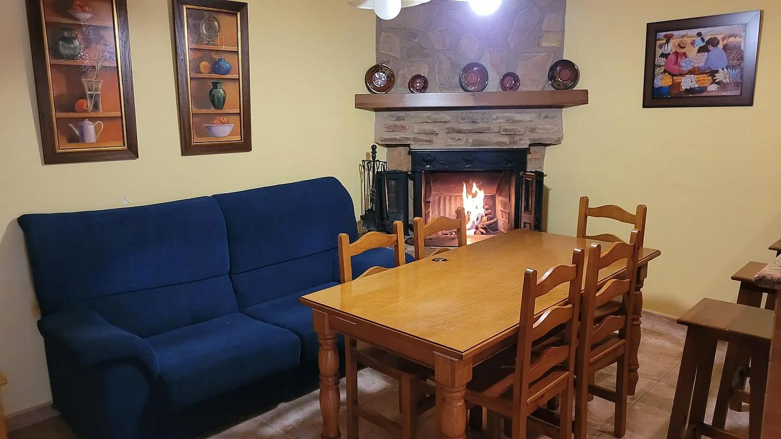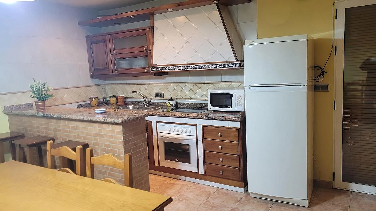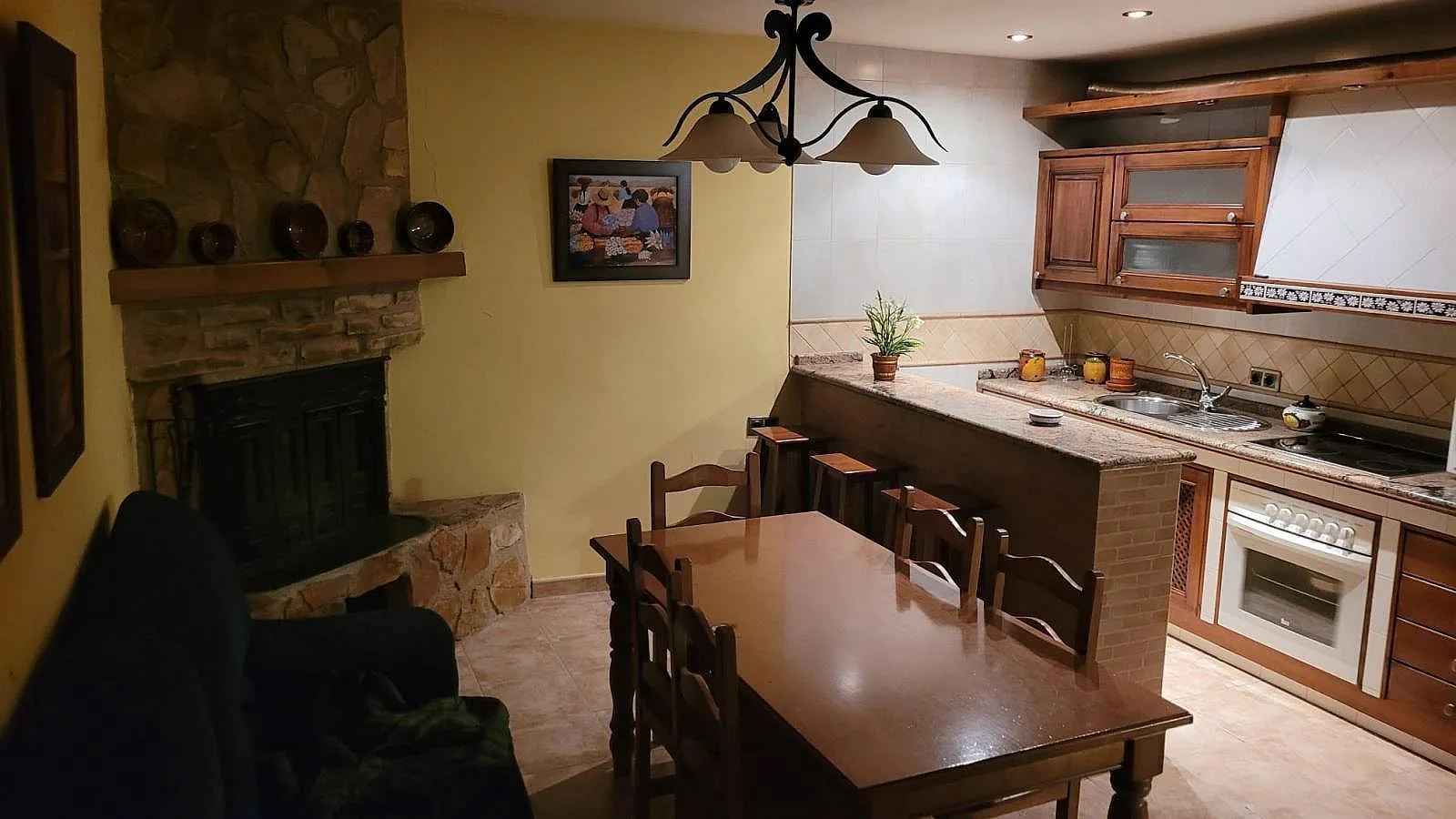 En la primera planta se encuentra el salón con cocina, chimenea y barra.
