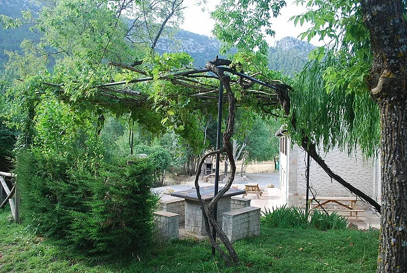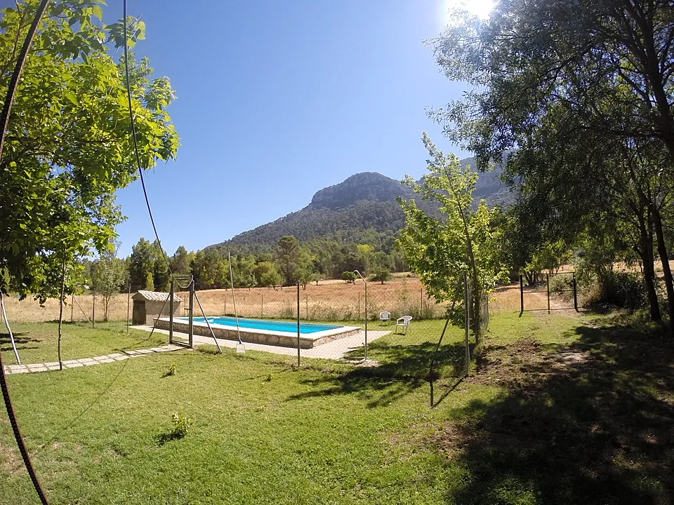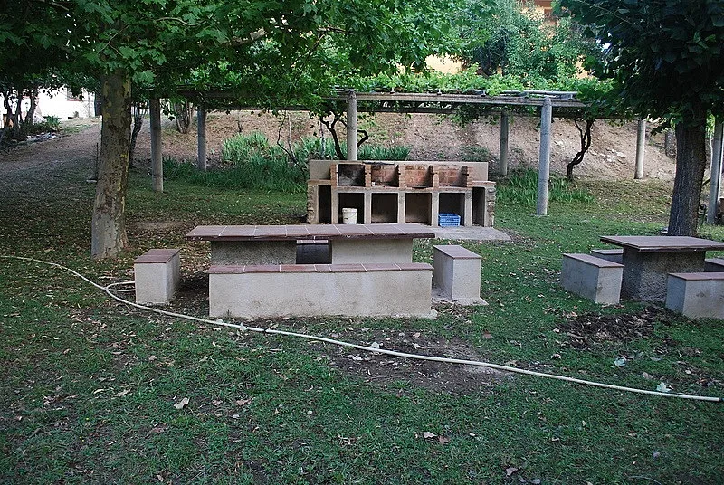 En la parte exterior encontramos un jardín con piscina, barbacoa con mesas y una zona para aparcar.