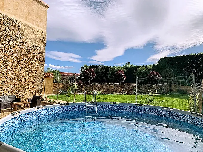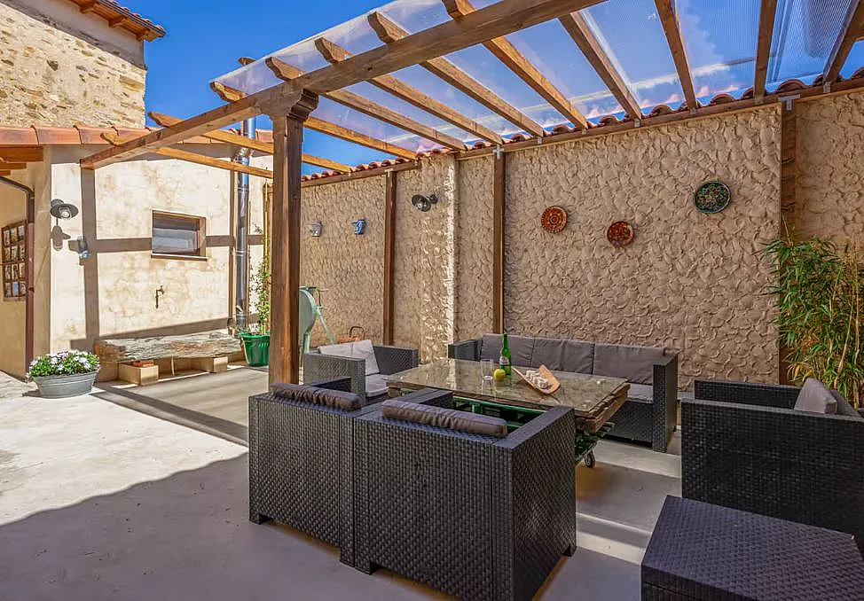 Las zonas comunes incluyen un comedor, un salón con chimenea y una cocina completamente equipada. En el exterior, los huéspedes pueden disfrutar de una balconada, un amplio patio, y una zona de barbacoa y merendero cubierto. También cuenta con piscina portátil, perfecta para el verano.