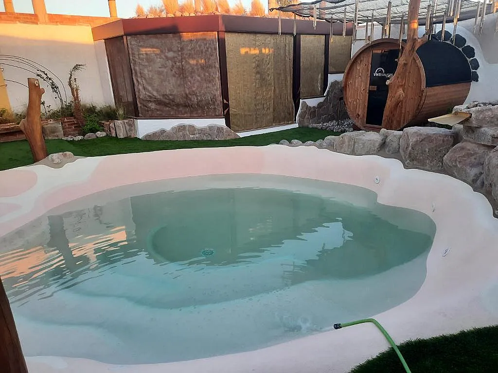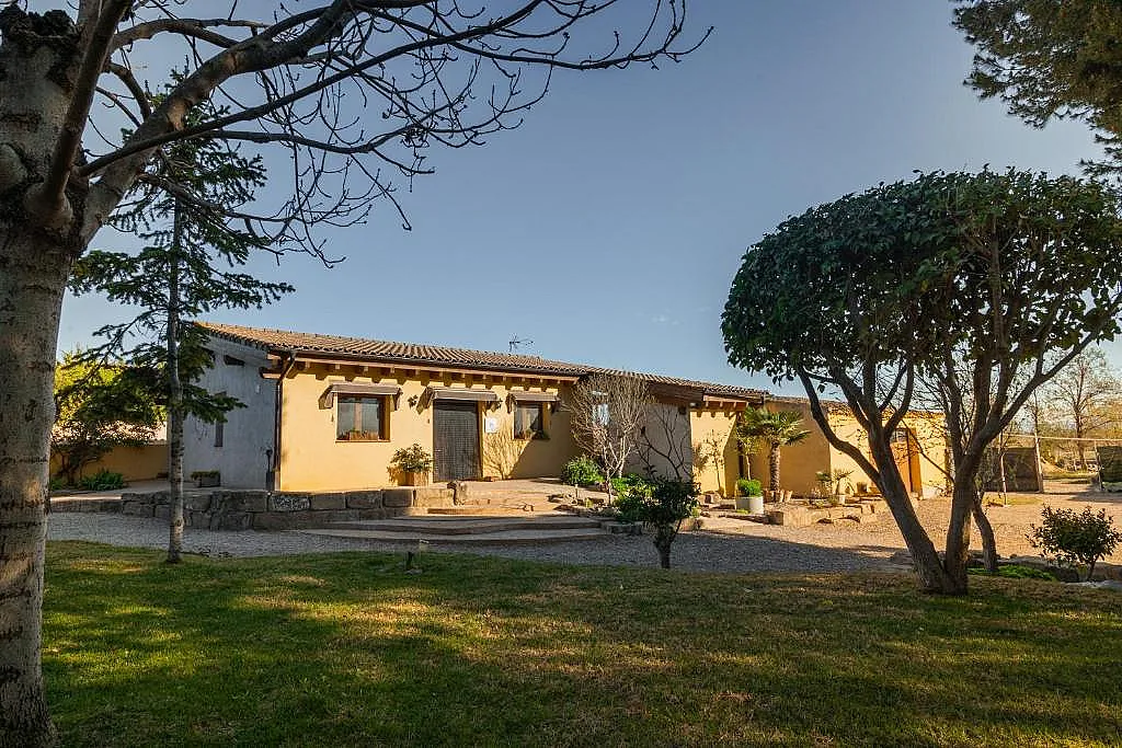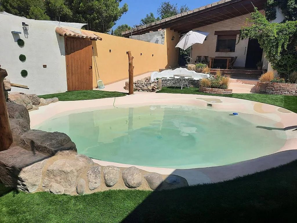 En el exterior se suman dos jardines de 4.000 m² y 1.000 m², embalses, barbacoa con leña y un patio con arenal y columpio para los más pequeños. La propiedad dispone además de un área de juegos y deporte de 2.000 m² y aparcamiento para 3 vehículos.