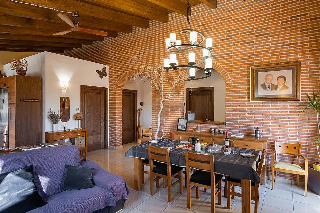 La sala de estar-comedor es una estancia diáfana bajo vigas de madera, con una mesa para 8 personas. La cocina, elaborada en granito y madera de cerezo, cuenta con electrodomésticos completos y campana de acero inoxidable. Los baños están adaptados para personas con movilidad reducida.