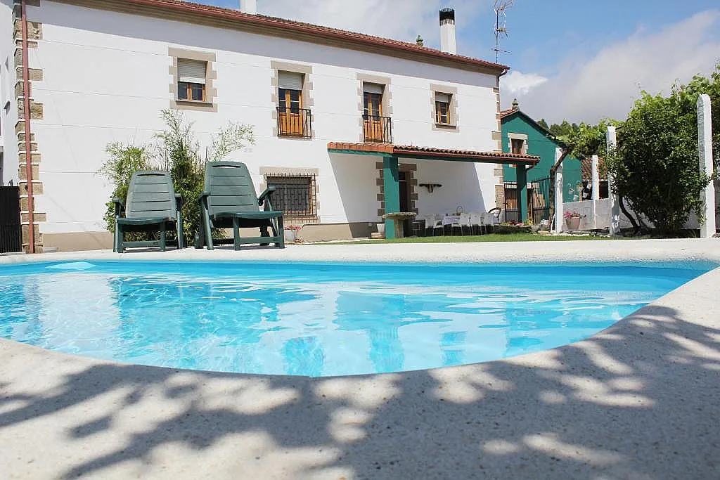 El exterior ofrece amplias zonas verdes, jardín privado, piscina, porche con zona para comer al aire libre y aparcamiento dentro del recinto para varios vehículos.