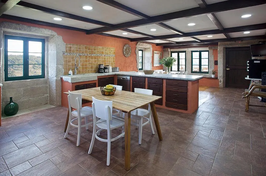 Dispone de 7 habitaciones con baño, distribuidas en 4 con cama doble, 1 con 2 camas individuales y 2 con 2 camas dobles y sofá cama. En el interior cuenta además con 3 salones amplios, 2 de ellos con chimenea de leña, 2 terrazas con vistas a los viñedos y una cocina totalmente equipada con un porche dividido en zona de estar y comedor.