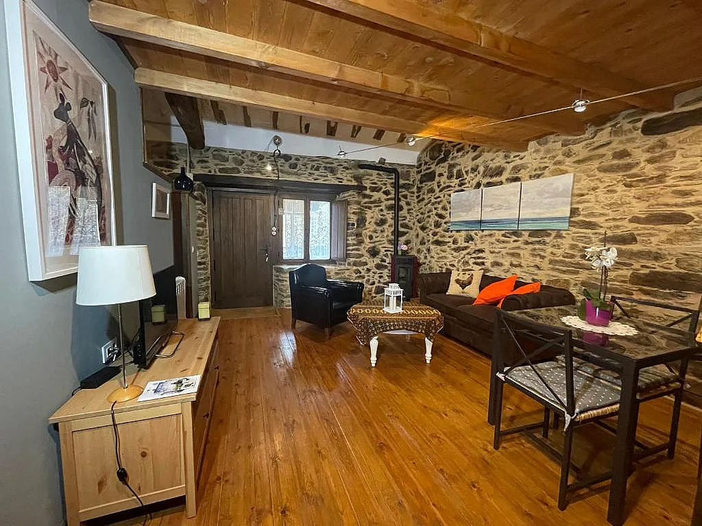 La casa de Cobos, situada en la aldea rural de Cobos, en plena Ribeira Sacra. Dentro de esta antigua casa de labranza restaurada con esmero se encuentra el Apartamento Felicitas, un espacio independiente para 2 personas que combina la calidez de los muros de piedra originales.