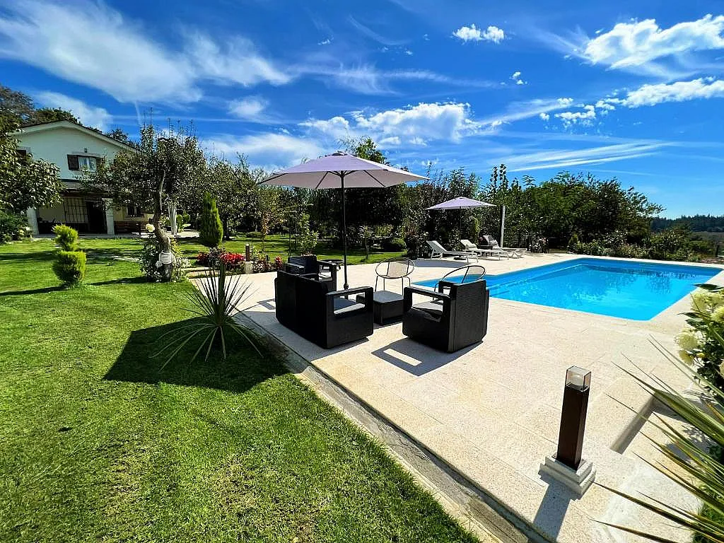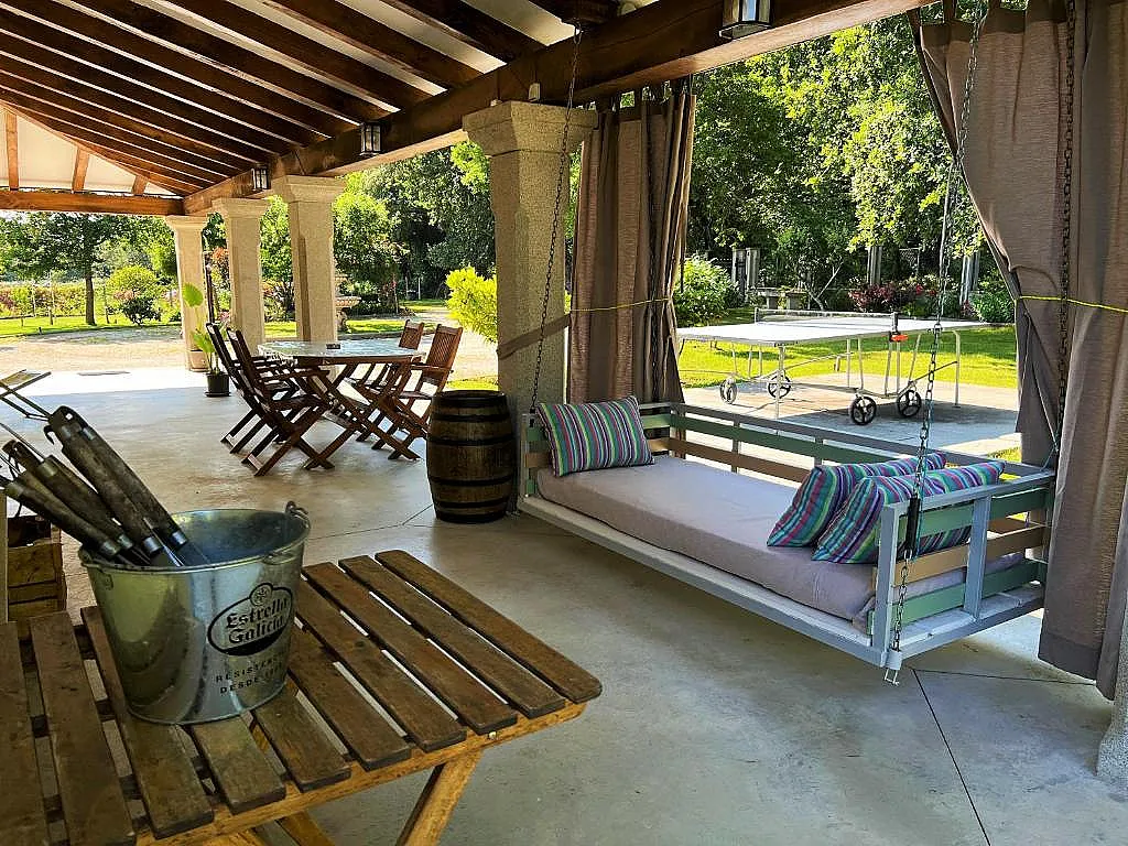 Villa Albaredo está pensada también para quienes teletrabajan, con Wi-Fi de alta velocidad y escritorio disponible. En el exterior, la casa ofrece amplias zonas ajardinadas, una piscina con vistas a la montaña, barbacoa, plancha de gas y espacios para actividades al aire libre como vóley, ping pong o dardos. Incluso hay un pequeño parque de calistenia