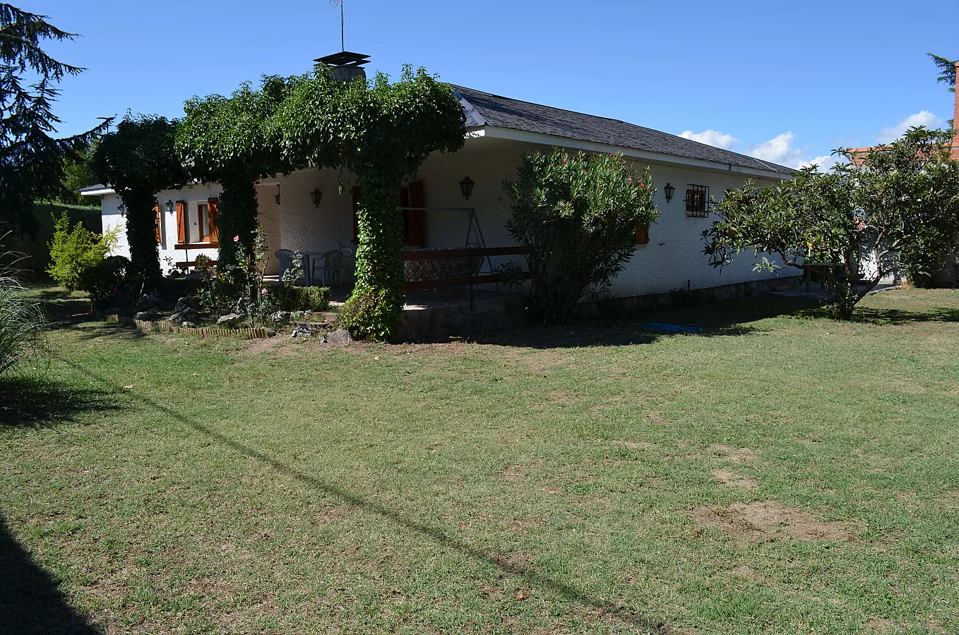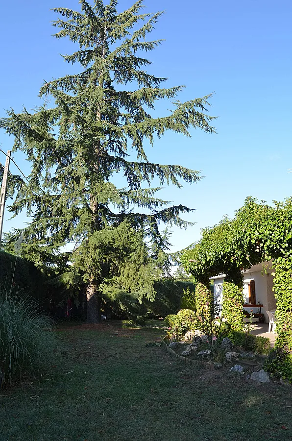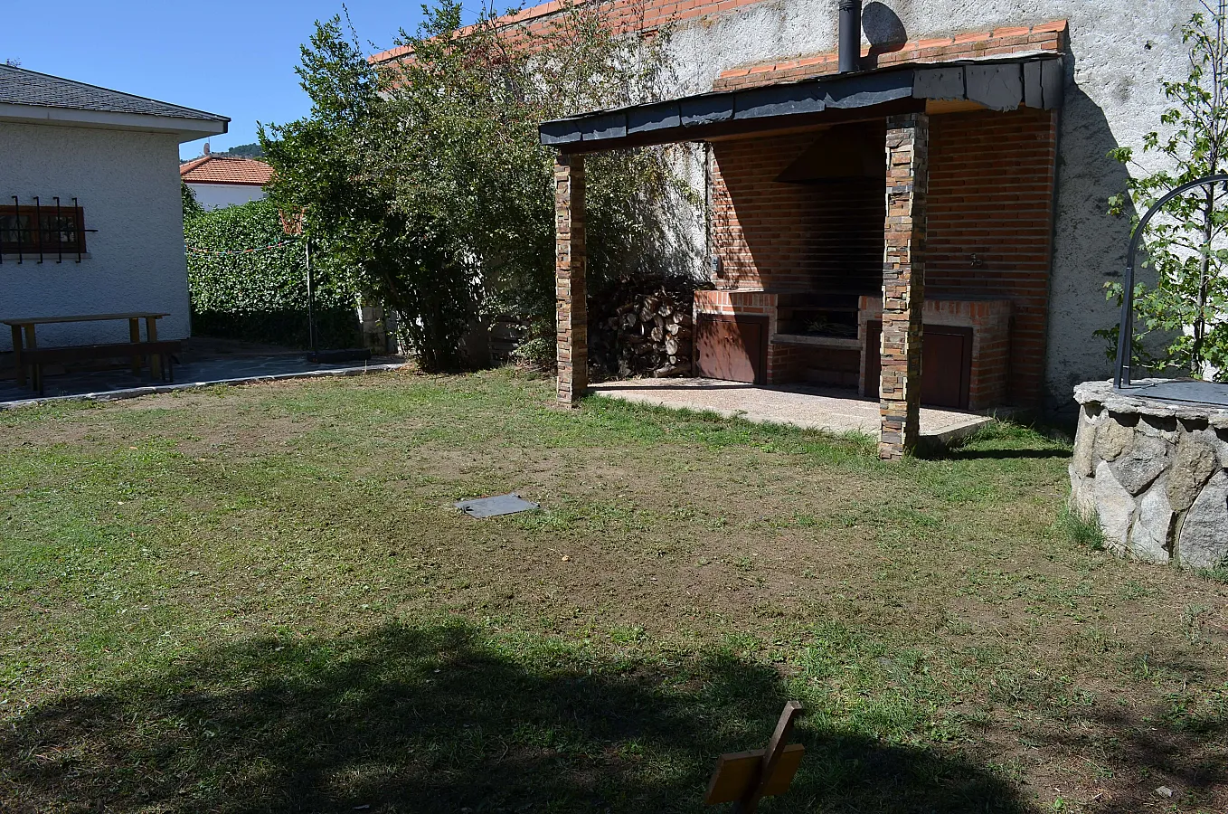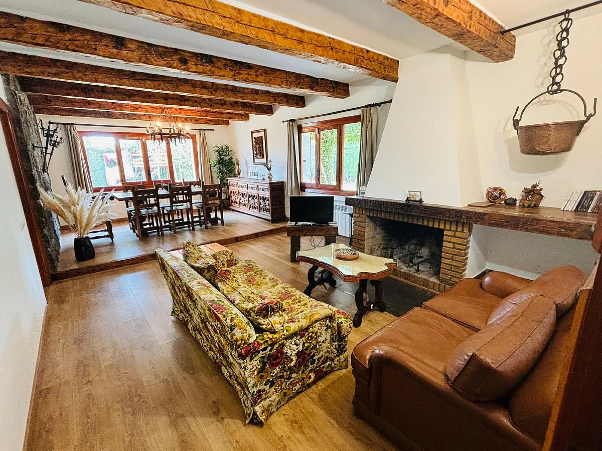 Chalet rústico muy amplio, en una sola planta, para una o dos familias o grupo de amigos, con chimenea, totalmente equipado, con piscina particular grande, barbacoa, 3 porches, cabaña en un árbol y amplio jardín con cesped. Casa muy cómoda con internet, wifi, juegos de mesa, etc. Con 4 habitaciones amplias con armarios, sala de juegos para el disfrute y relax, salón comedor muy rústico con chimenea, cocina muy amplia totalmente equipada y 3 baños.