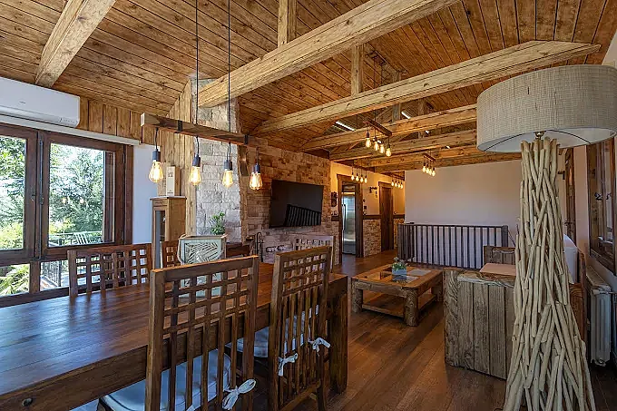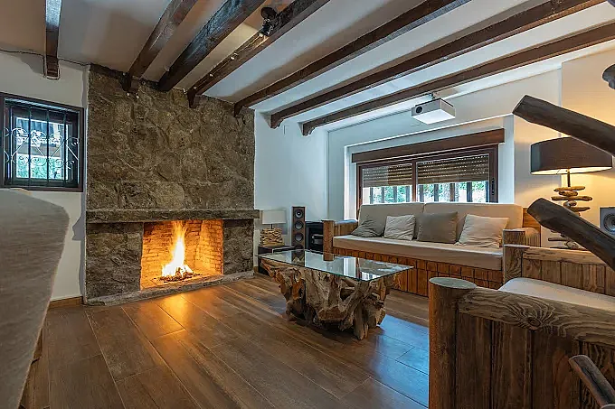 En el interior destaca un salón principal con chimenea de leña, sofá convertible en cama y zona de comedor junto a grandes cristaleras con vistas. La casa dispone además de 2 salas de ocio diferenciadas: una con billar y barra con taburetes, y otra habilitada como sala de cine con pantalla gigante y sillones, equipada con una amplia oferta de canales internacionales.