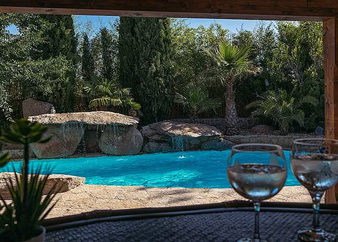 En el exterior, Villa Oasis Madrid ofrece una piscina climatizada de agua salada con decoración natural, zona de barbacoa con horno de barro, cocina campera y un estanque con peces y áreas de descanso.
