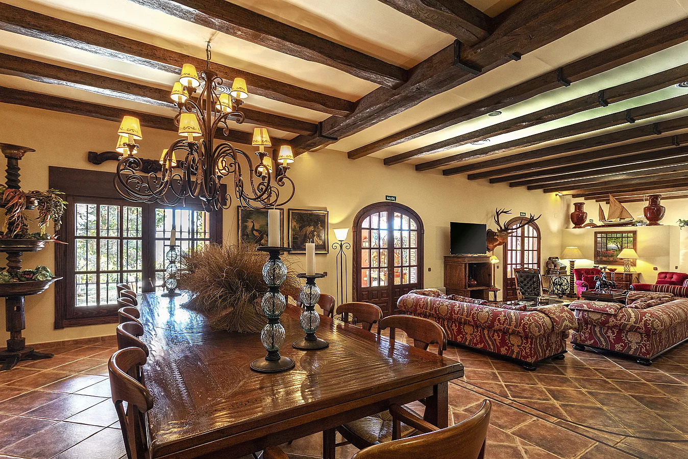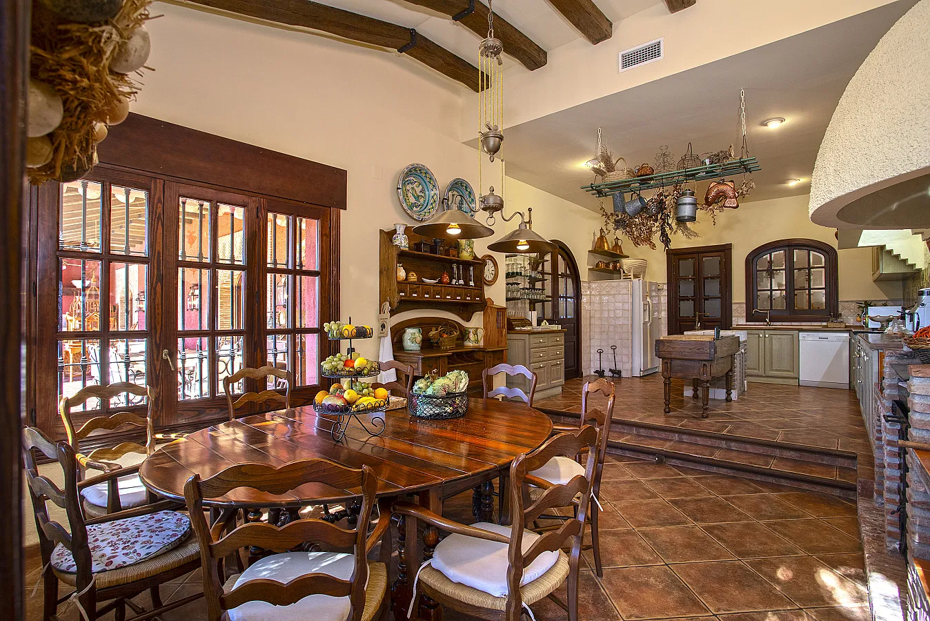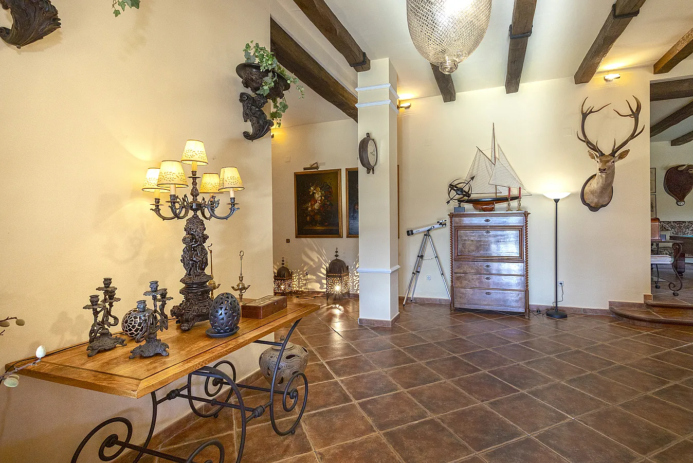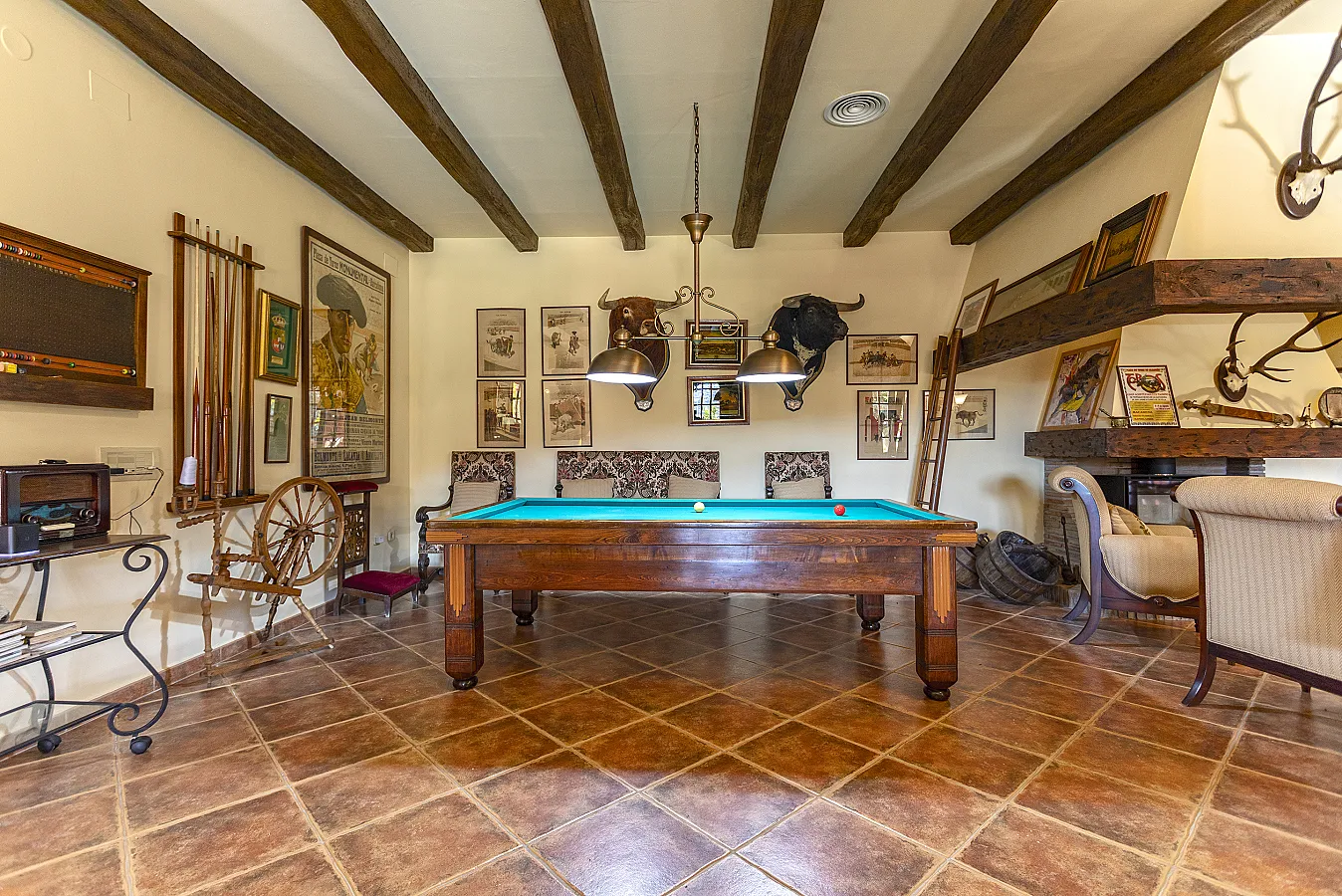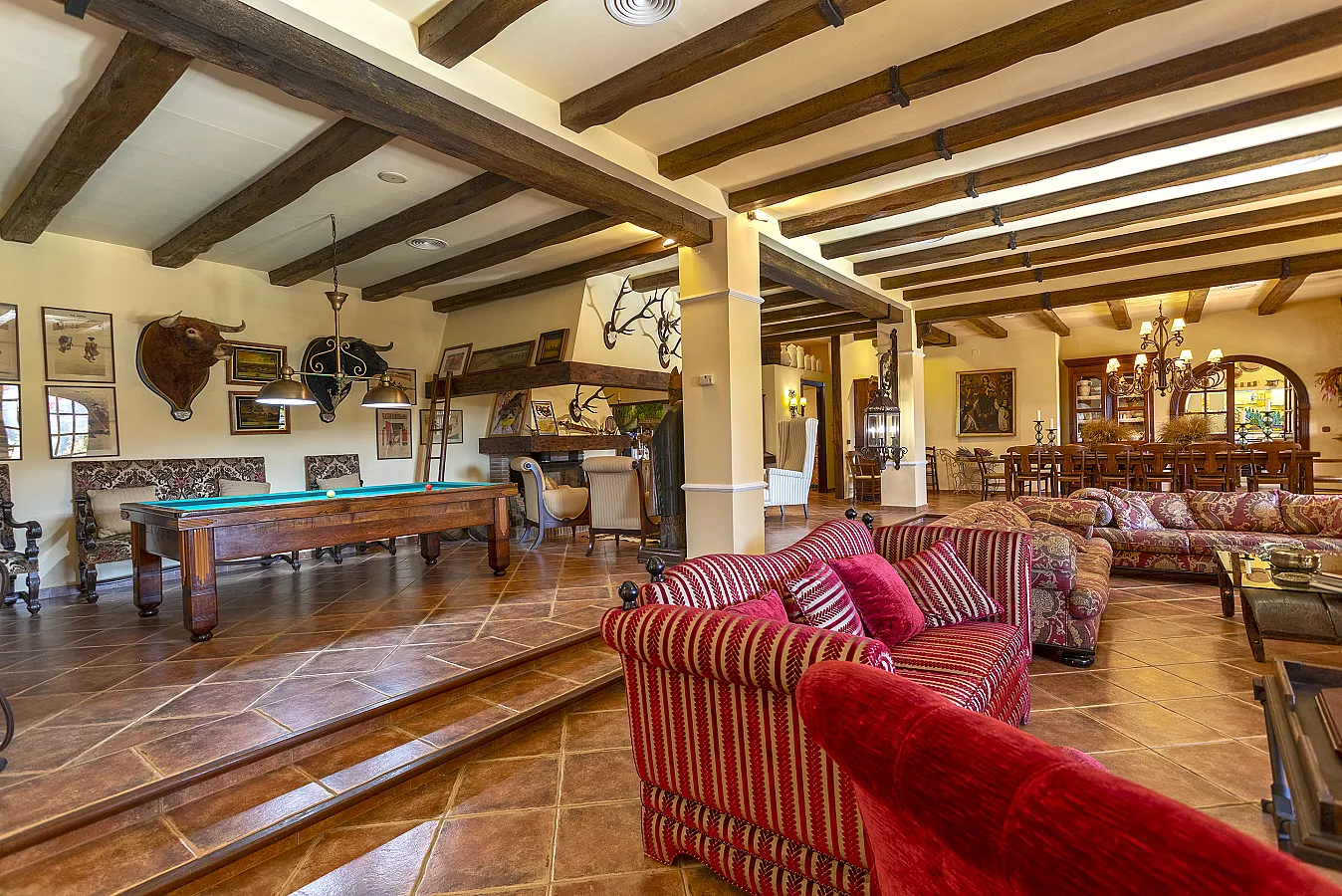 En planta baja un gran salón con chimenea, mesa de carambolas, piscina interior climatizada, dos sofás, mesa de juego y una gran mesa de comedor junto a la cocina, la casa dispone de bodega y ascensor.
