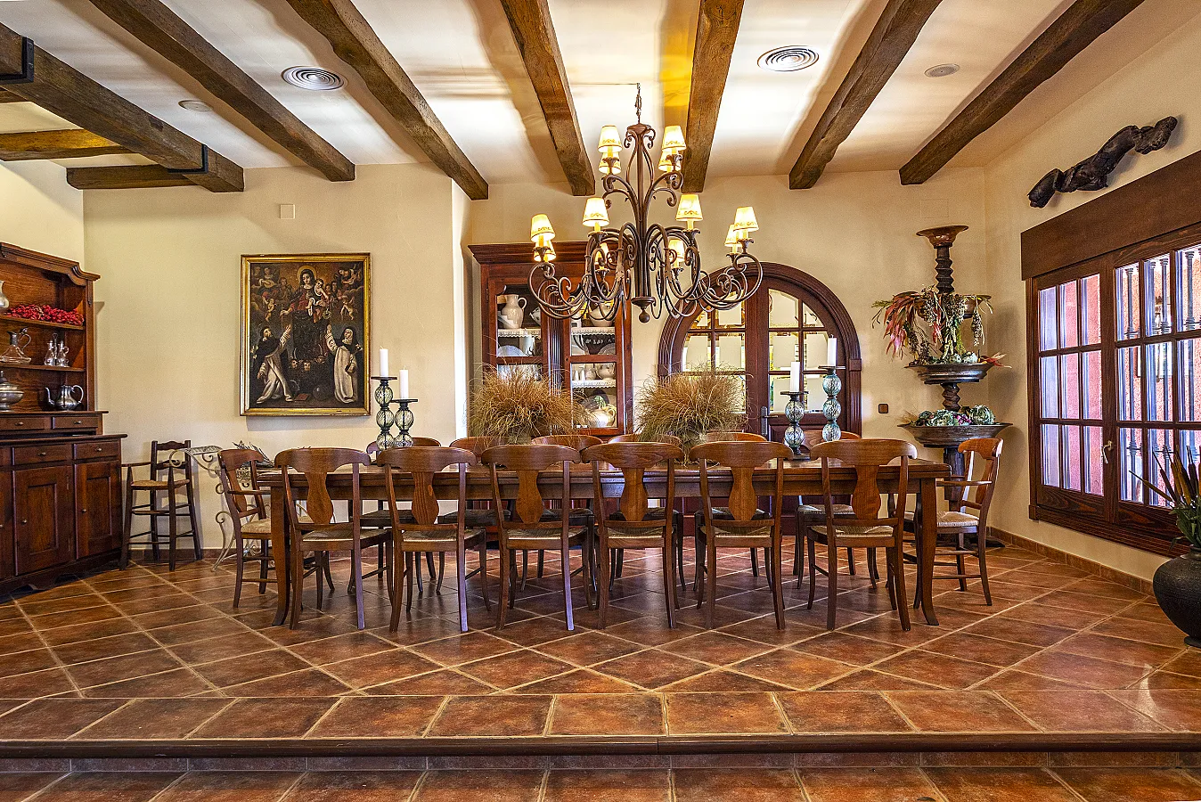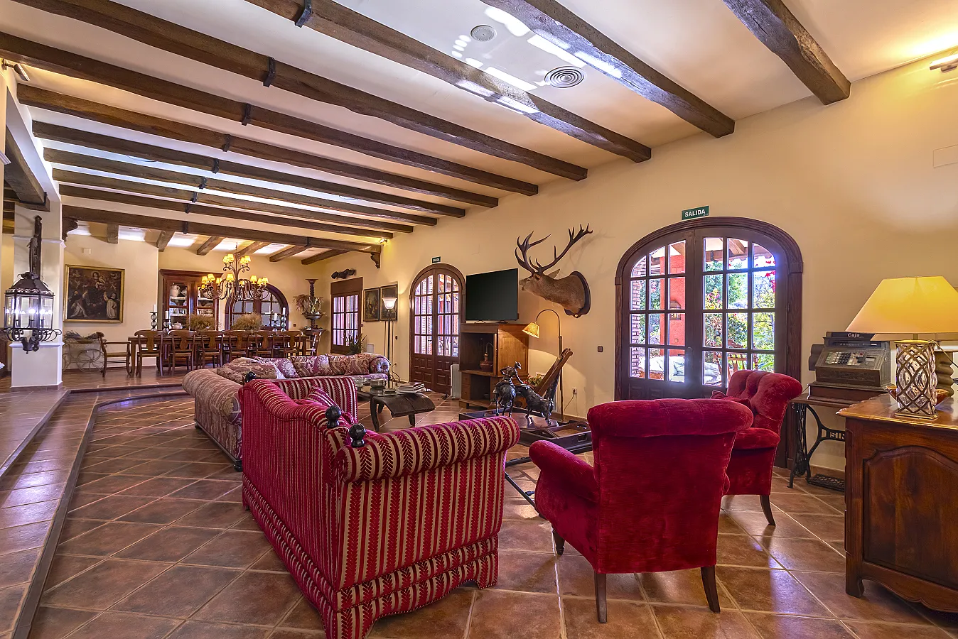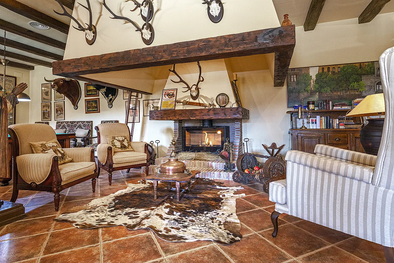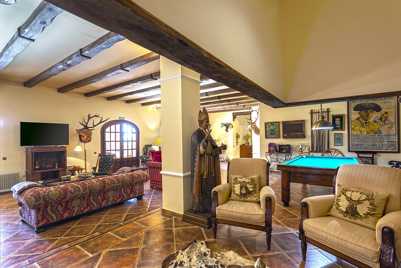 En planta baja un gran salón con chimenea, mesa de carambolas, piscina interior climatizada, dos sofás, mesa de juego y una gran mesa de comedor junto a la cocina, la casa dispone de bodega y ascensor.