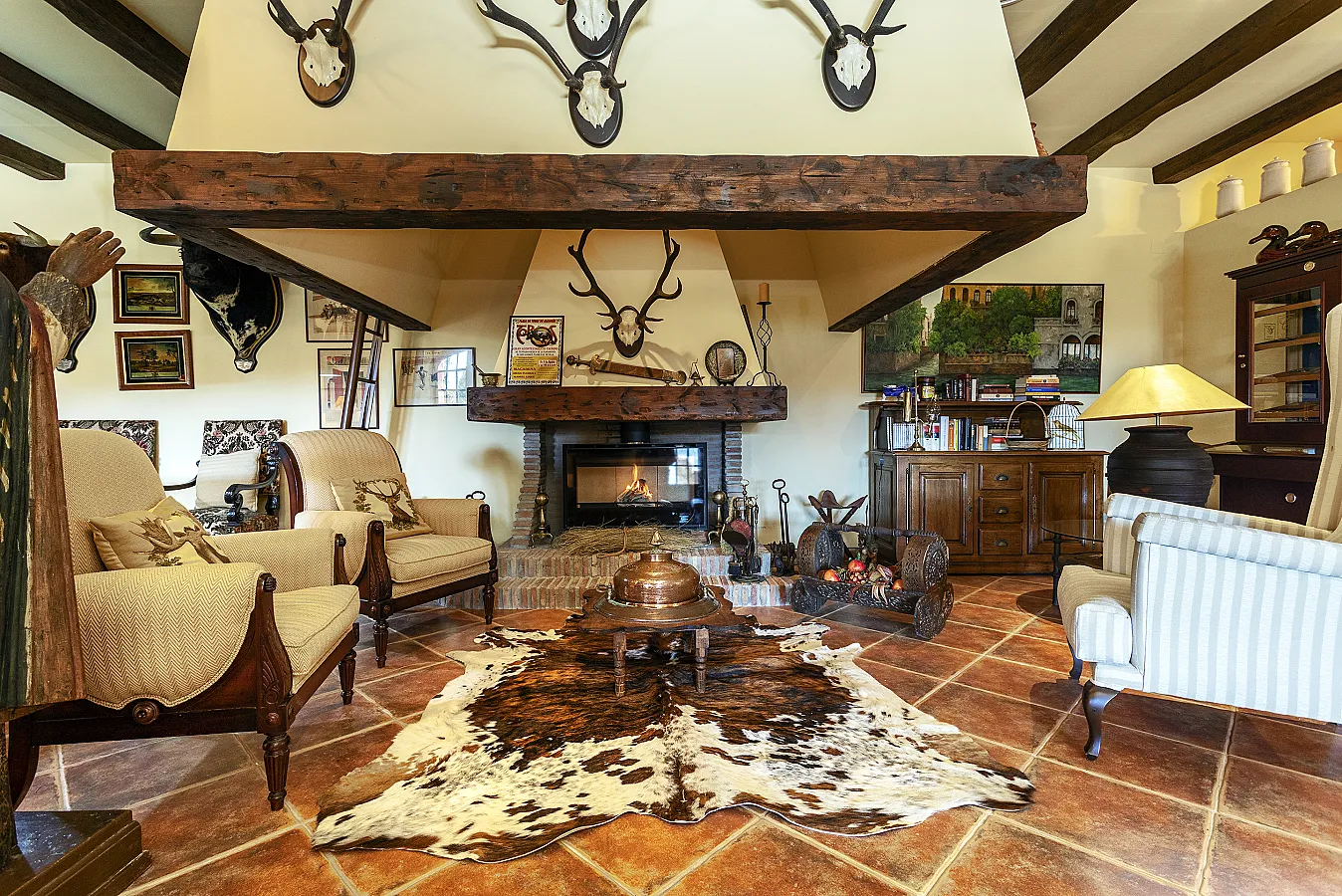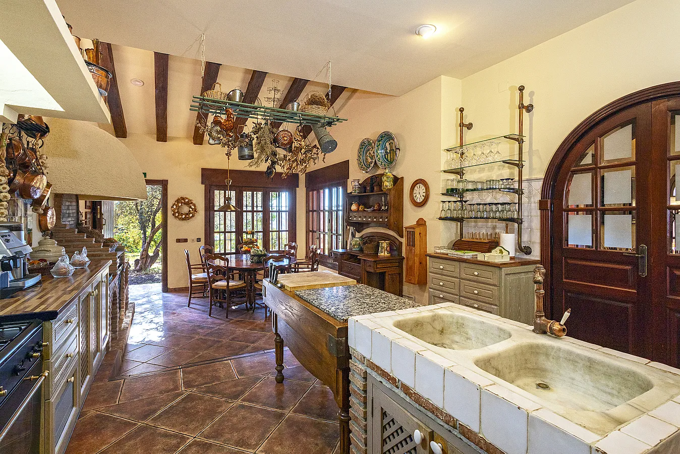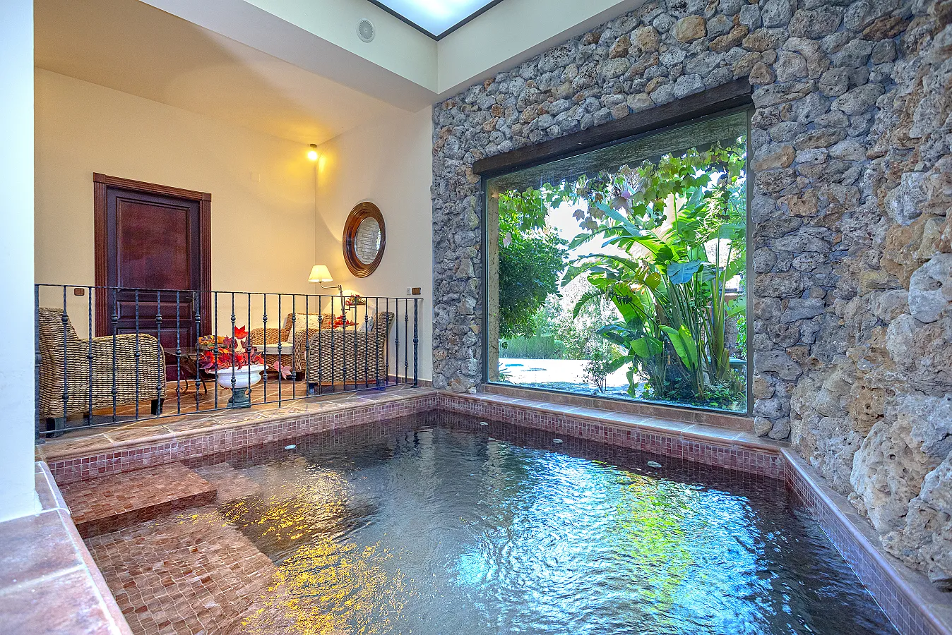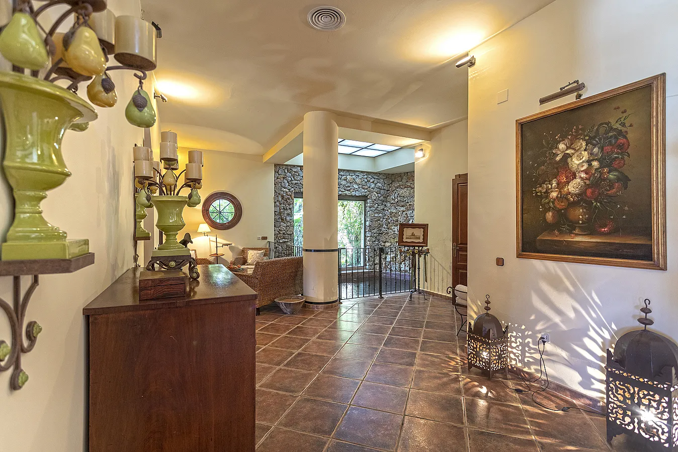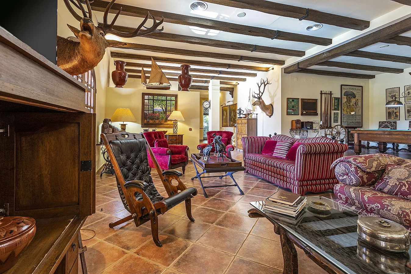 En planta baja un gran salón con chimenea, mesa de carambolas, piscina interior climatizada, dos sofás, mesa de juego y una gran mesa de comedor junto a la cocina, la casa dispone de bodega y ascensor.