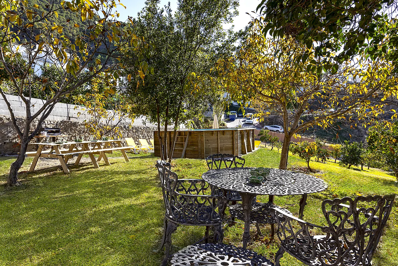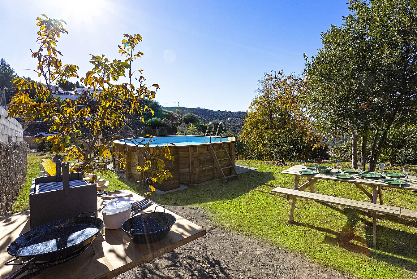 Junto a la piscina exterior hay hamacas, zona de barbacoa y mesas para estar al aire libre.