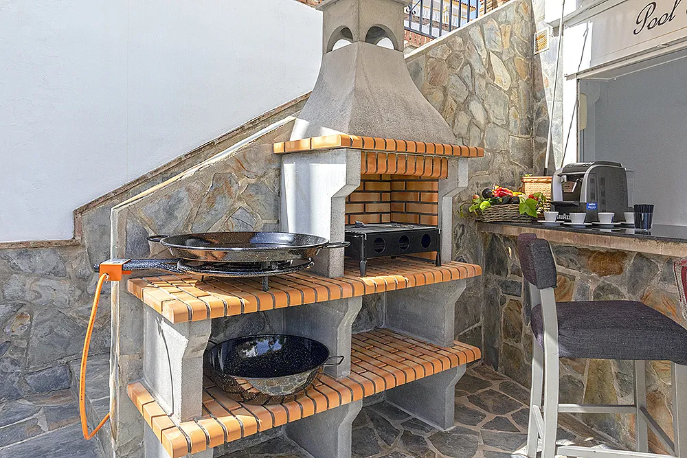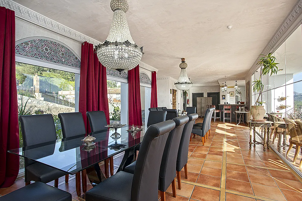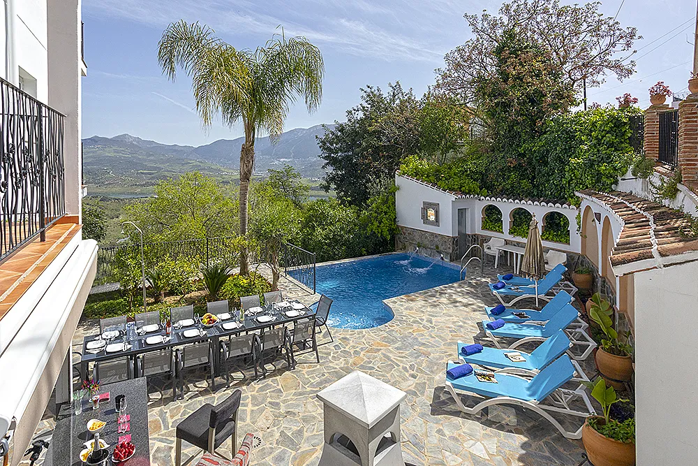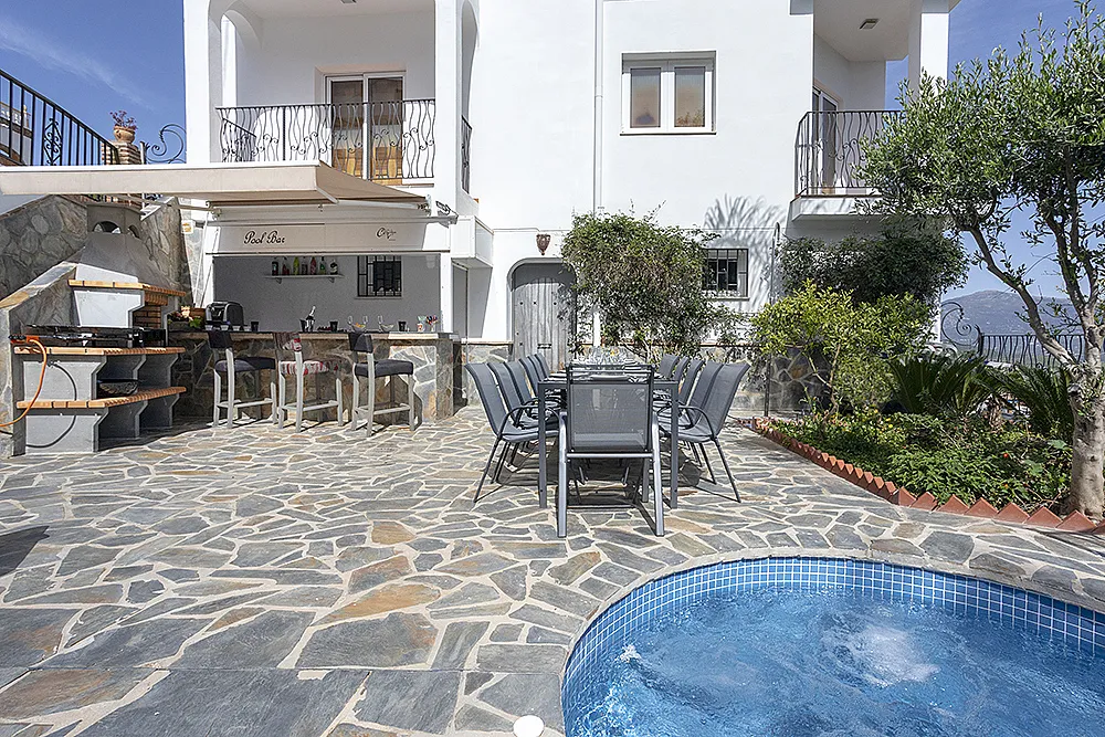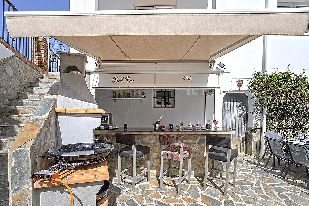 Salón comedor con vistas al embalse de La Viñuela, con bar y terraza y cocina completamente equipada con barbacoa de piedra volcánica.