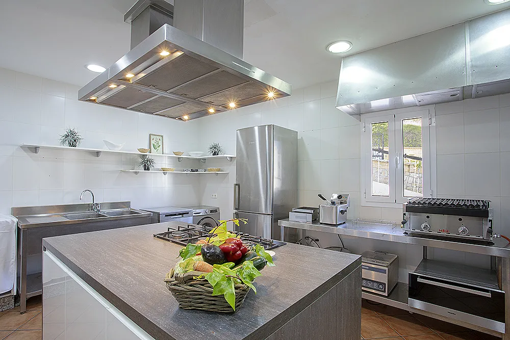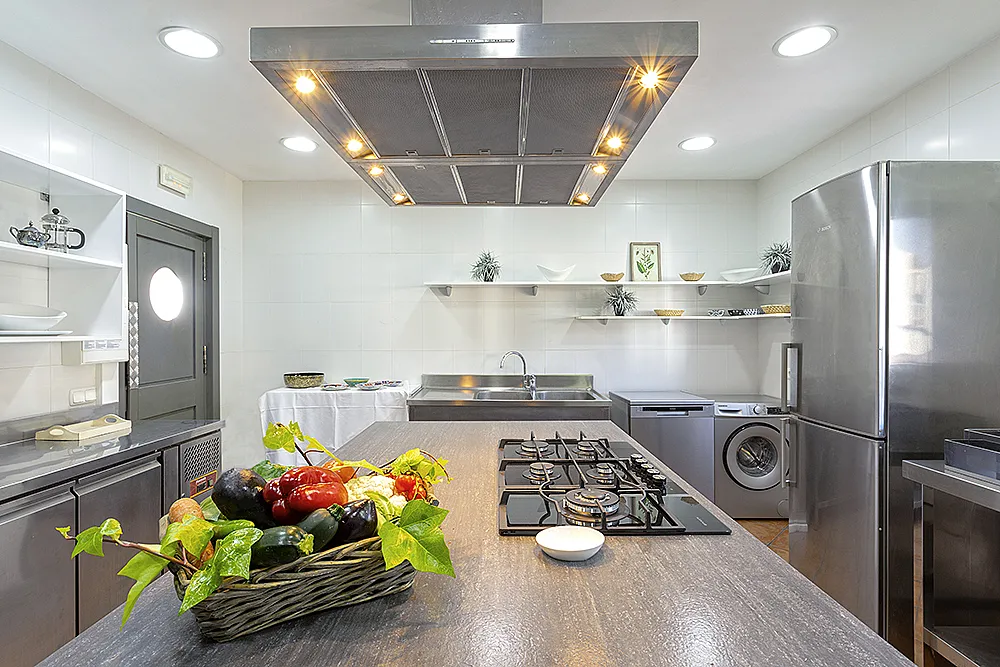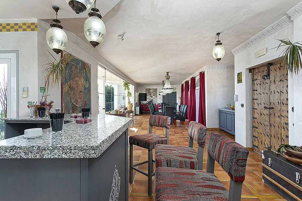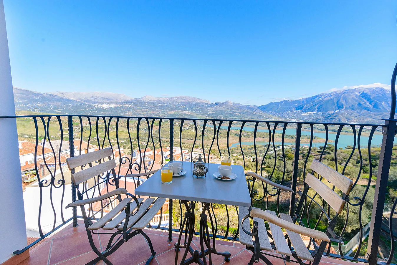 Salón comedor con vistas al embalse de La Viñuela, con bar y terraza y cocina completamente equipada con barbacoa de piedra volcánica.