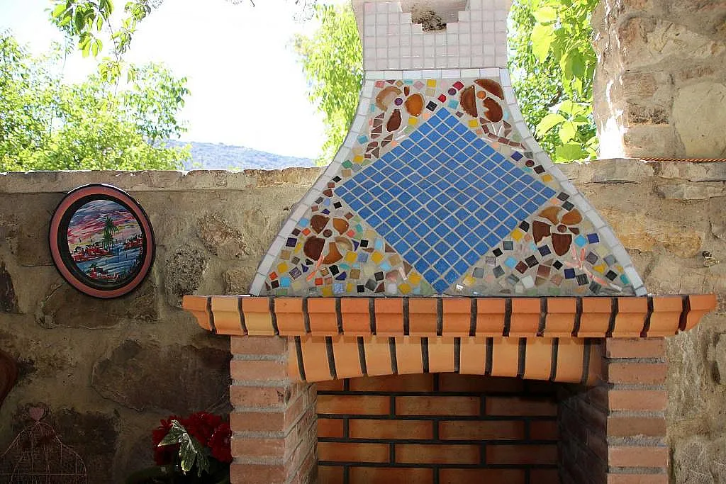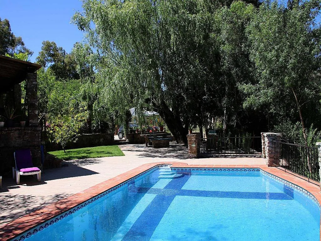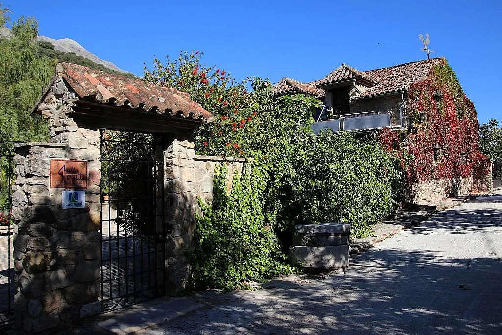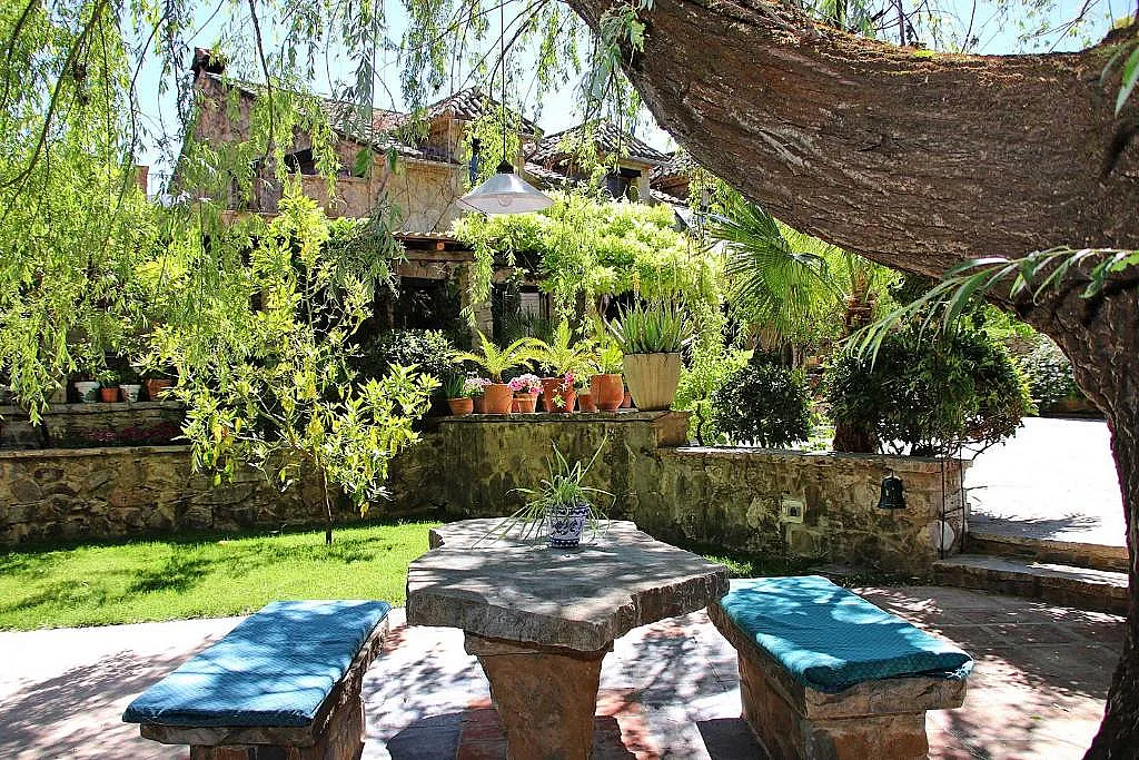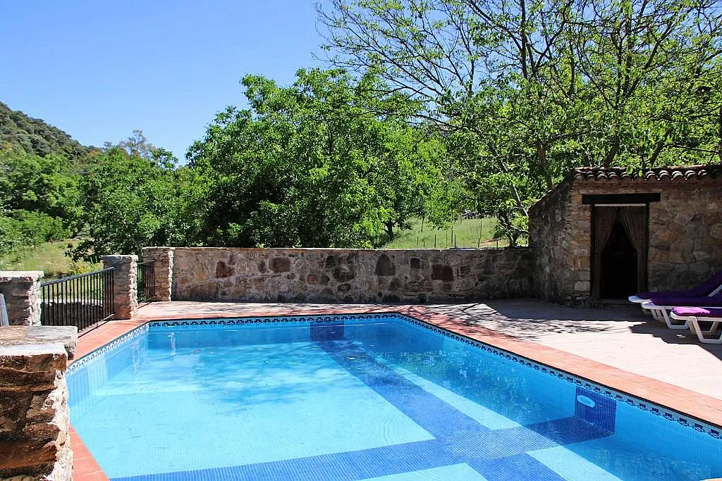El exterior está protegido por muros de piedra y cuenta con un porche cubierto, zona ajardinada, césped junto a la piscina climatizada -disponible del 1 de julio al 10 de septiembre- y aparcamiento para varios vehículos.
