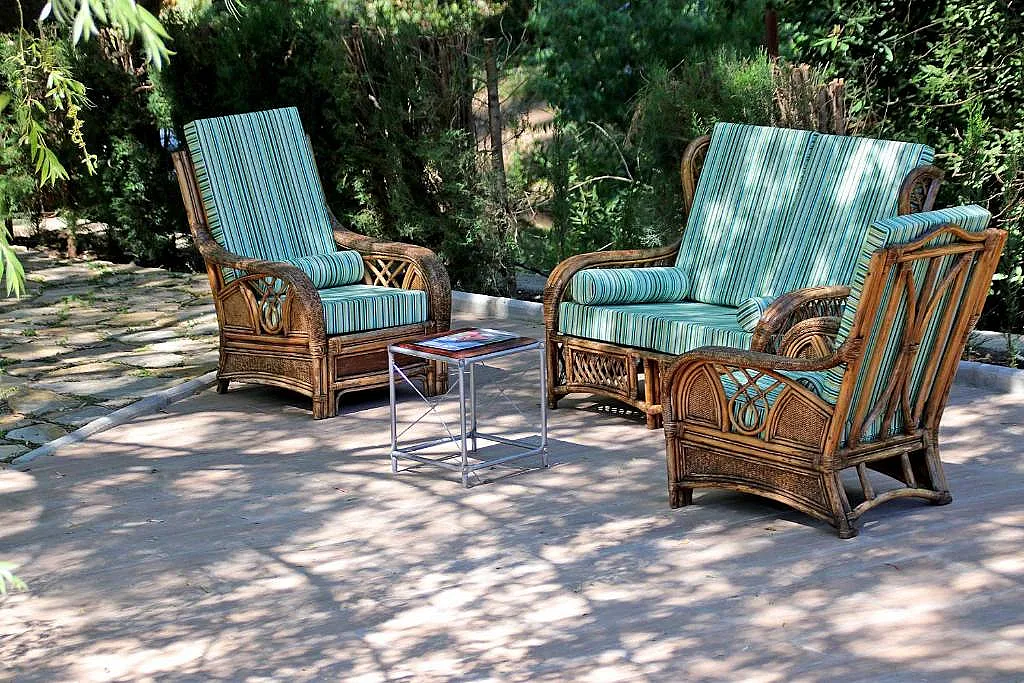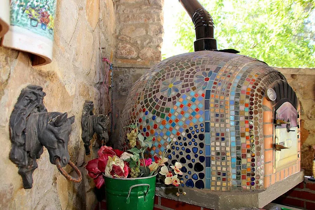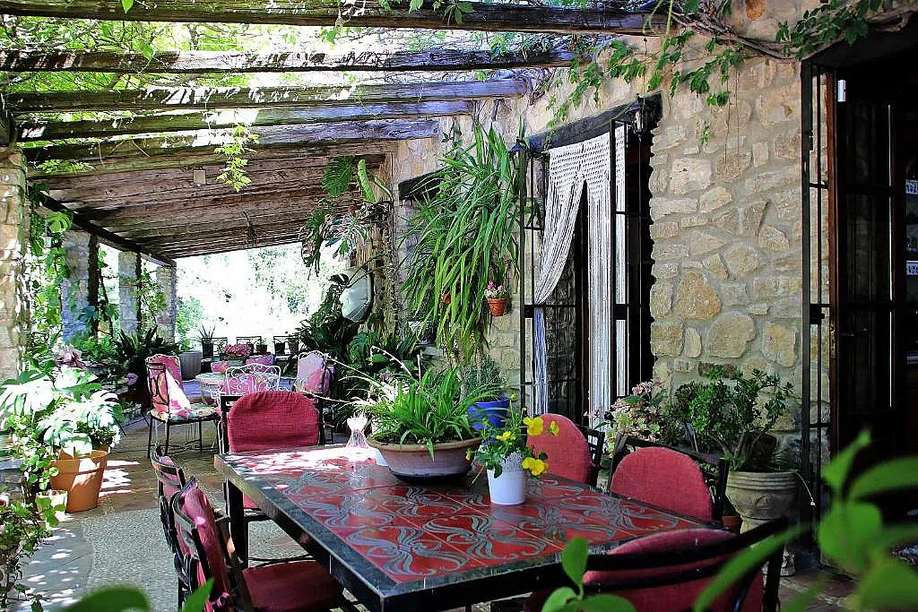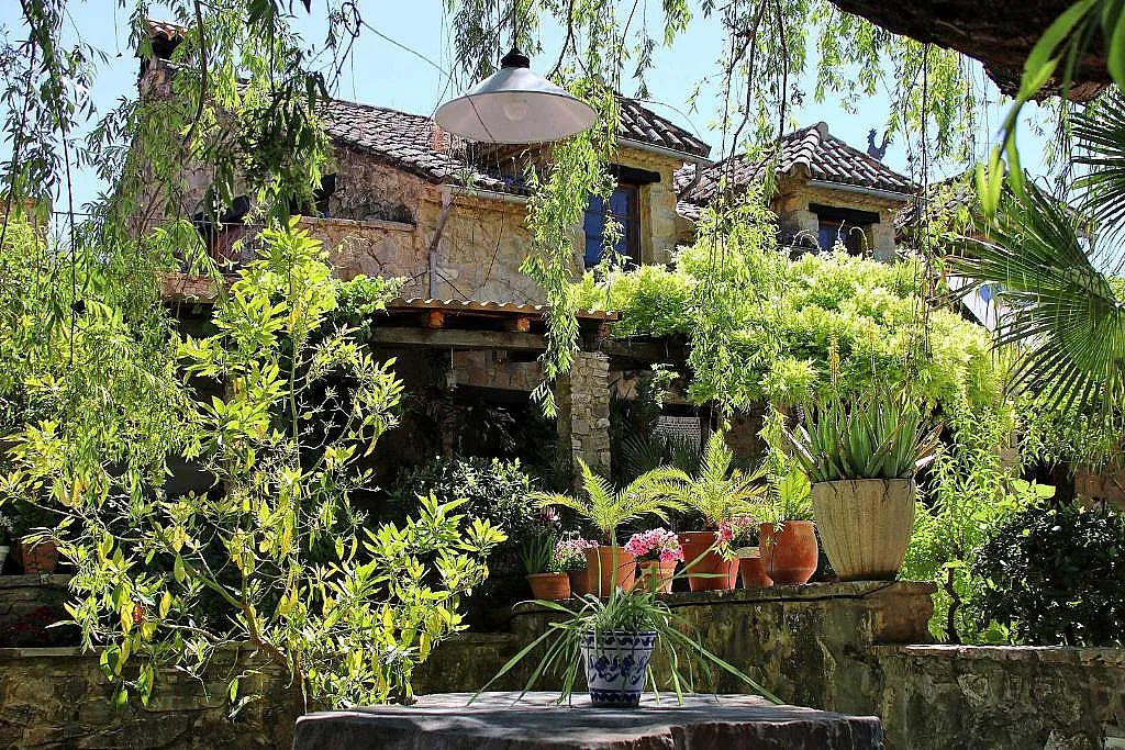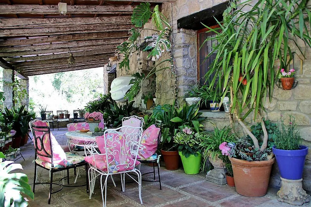 El exterior está protegido por muros de piedra y cuenta con un porche cubierto, zona ajardinada, césped junto a la piscina climatizada -disponible del 1 de julio al 10 de septiembre- y aparcamiento para varios vehículos.