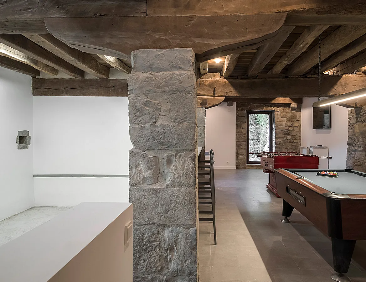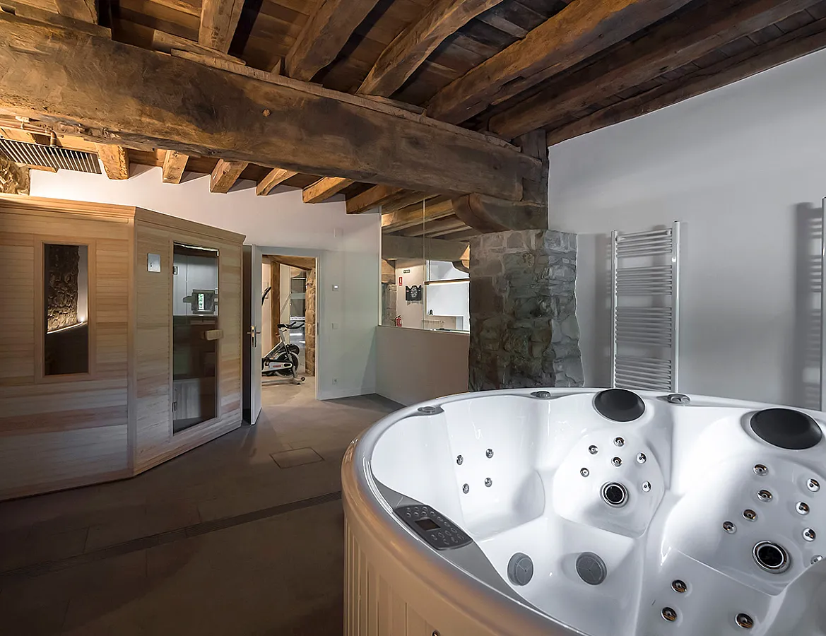 La planta baja, con 300 m², está dedicada por completo al ocio. Aquí se encuentra el minifrontón, la zona wellness con gimnasio, sauna y jacuzzi, así como el área de juegos con ping-pong, futbolín, billar, dardos y una gran pantalla con Wii. La vivienda cuenta también con wifi en toda la casa y numerosos juegos de mesa, de modo que los días de lluvia se pueden aprovechar sin salir al interior.