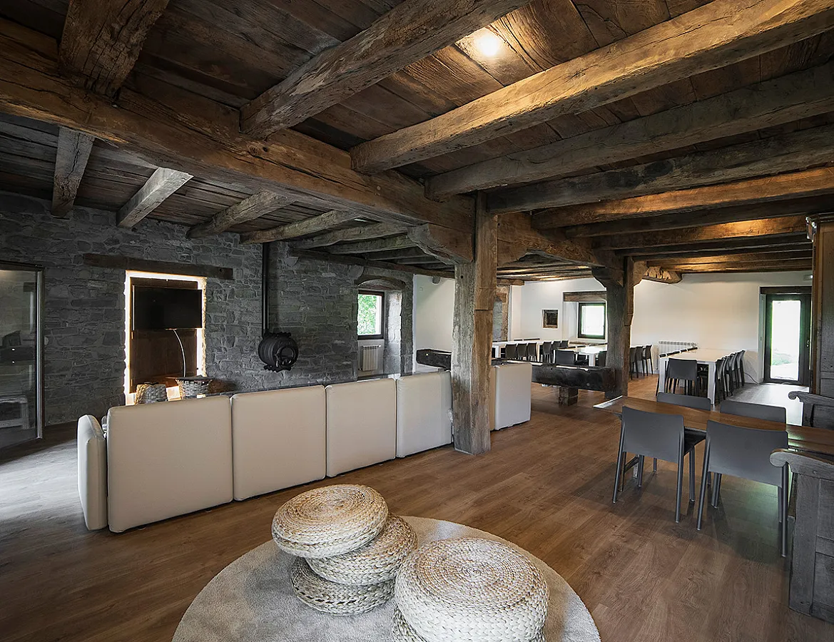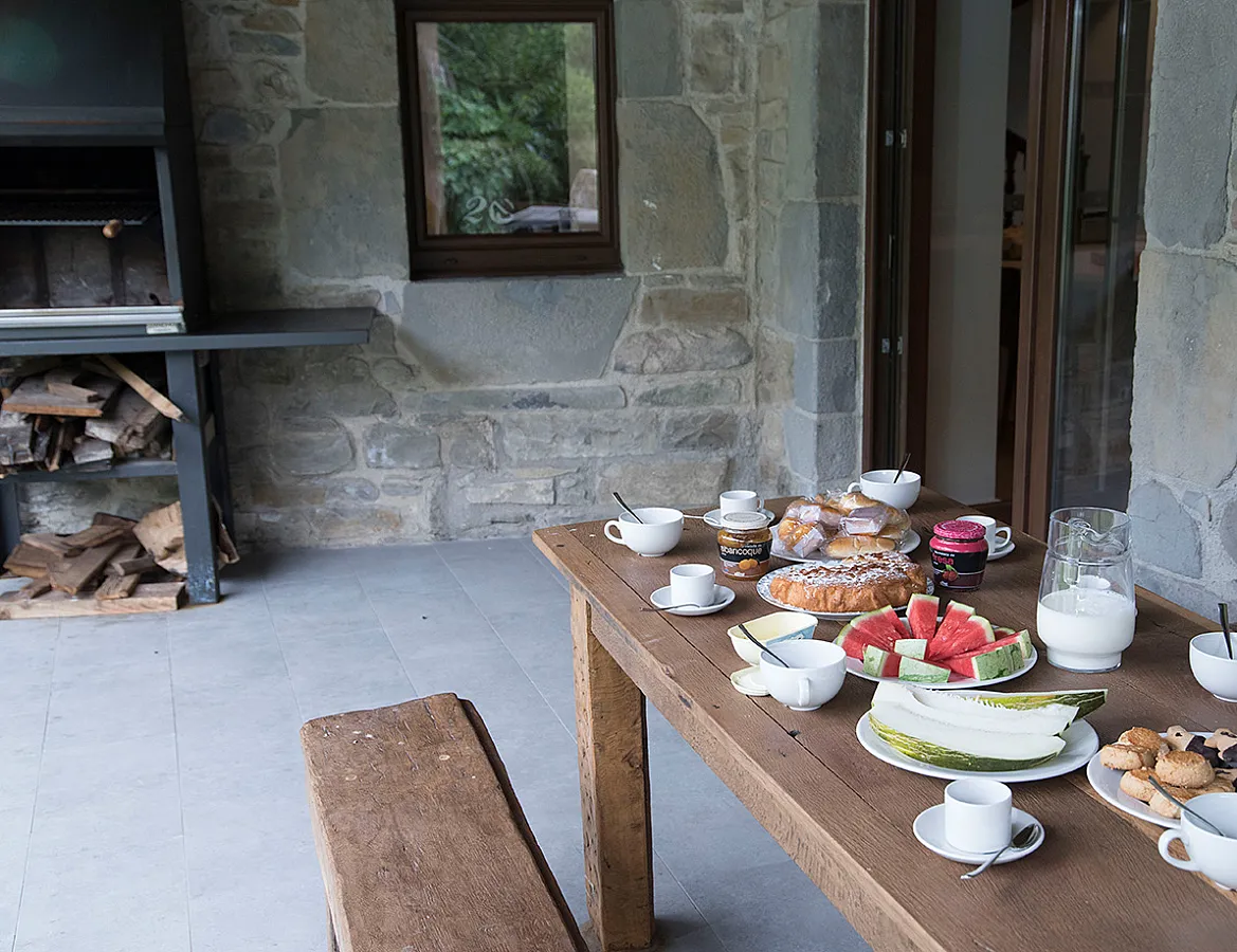 En el exterior, el jardín, el porche y el txoko trasero ofrecen espacios para descansar al aire libre o disfrutar de una barbacoa, un calderete o una paella en grupo. La amplitud del salón-comedor y la cocina permite reunir sin problema a unas 50 personas, lo que hace del palacio un lugar adecuado para encuentros familiares, convivencias o pequeñas celebraciones.
