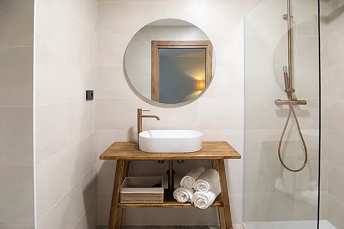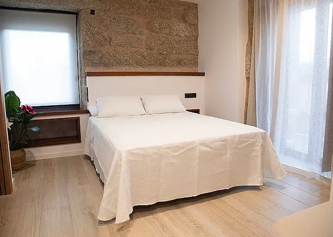 Sus muros de piedra, restaurados con respeto por su historia, y las vigas de castaño visibles en cada estancia, crean un ambiente cálido y auténtico. La iluminación cuidadosamente elegida resalta las texturas naturales, contribuyendo a una atmósfera acogedora.