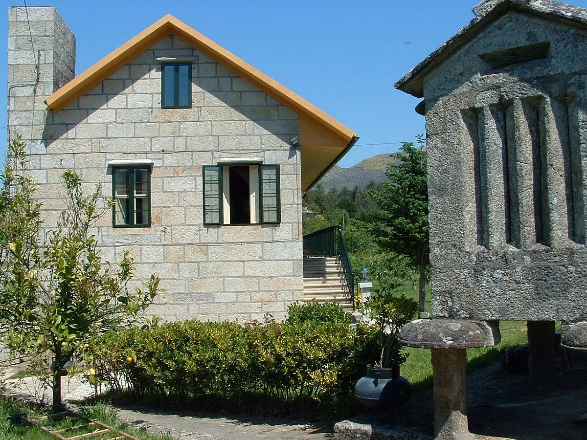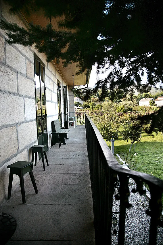 Un hermoso balcón al que se accede desde cada dependencia de la planta principal da la bienvenida a la finca de la casa, una amplia zona verde, rodeada de viñedo y salpicada por árboles frutales, en la que nos encontramos un típico hórreo gallego que descansa sobre seis centenarios pies.