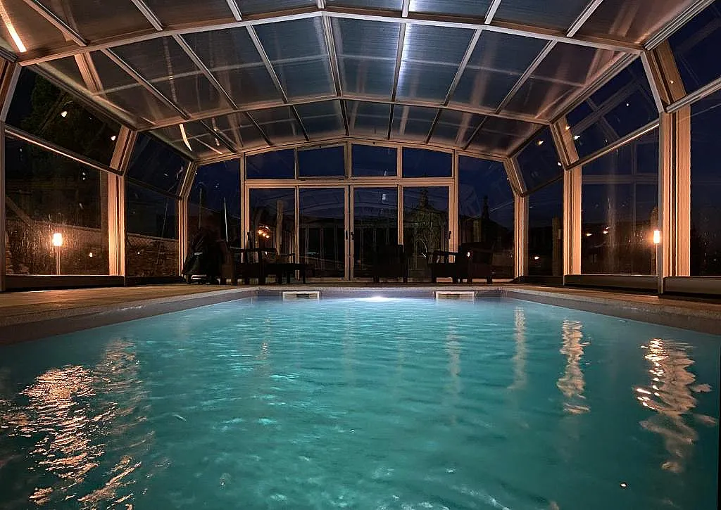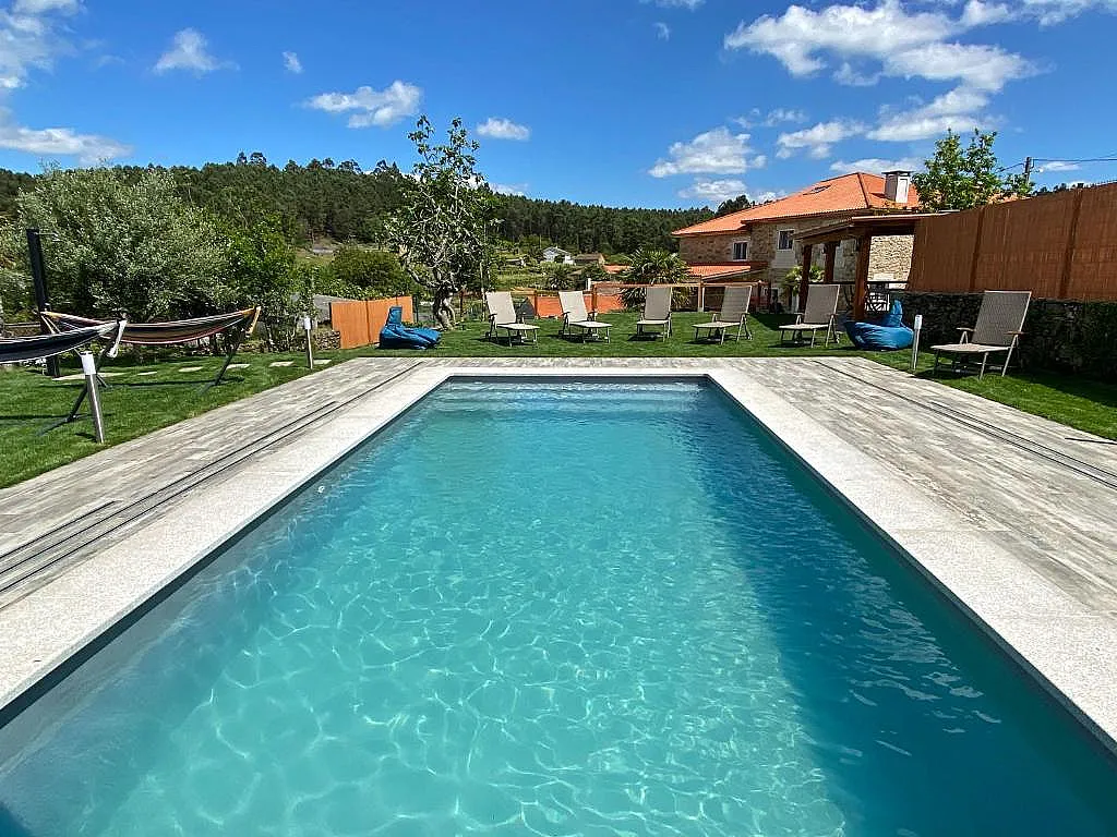 Los espacios de bienestar tienen un papel importante en este alojamiento. Entre ellos, una piscina climatizada que puede utilizarse todo el año, tanto cubierta como descubierta, un jacuzzi, duchas de hidromasaje y zonas de relax amuebladas con hamacas y puffs. El amplio patio interior conecta con jardines y un cenador con barbacoa.