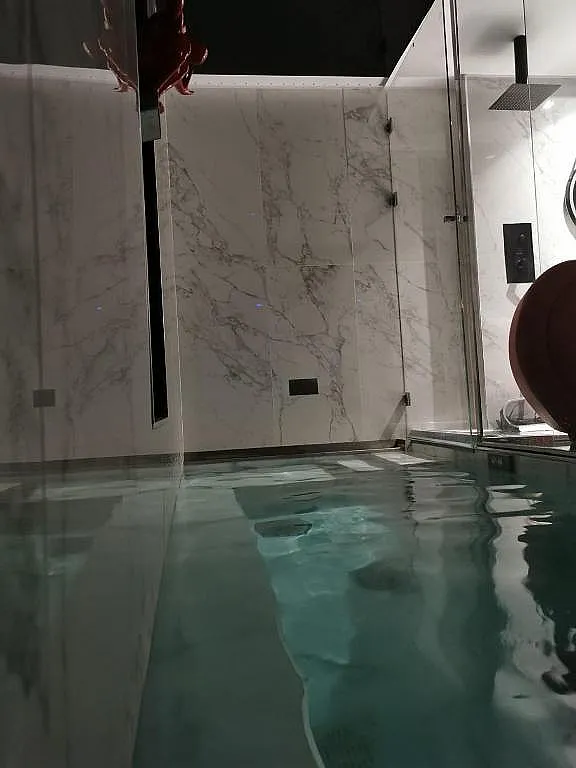 La piscina está rodeada por cristales que aportan luminosidad y permiten disfrutar del baño en cualquier momento, incluso activando el modo jacuzzi o jugando con la iluminación de colores. Esta conexión entre interior y exterior crea una atmósfera íntima ideal para compartir momentos de relax.