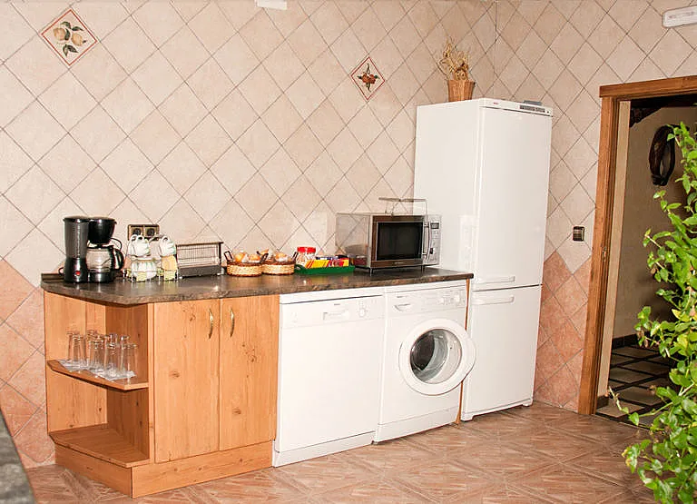 Cocina, en la cual hay: vitroceramica, lavavajillas, frigorífico, microondas, tostadora, cafetera, lavadora, batidora, vajilla y cubertería.