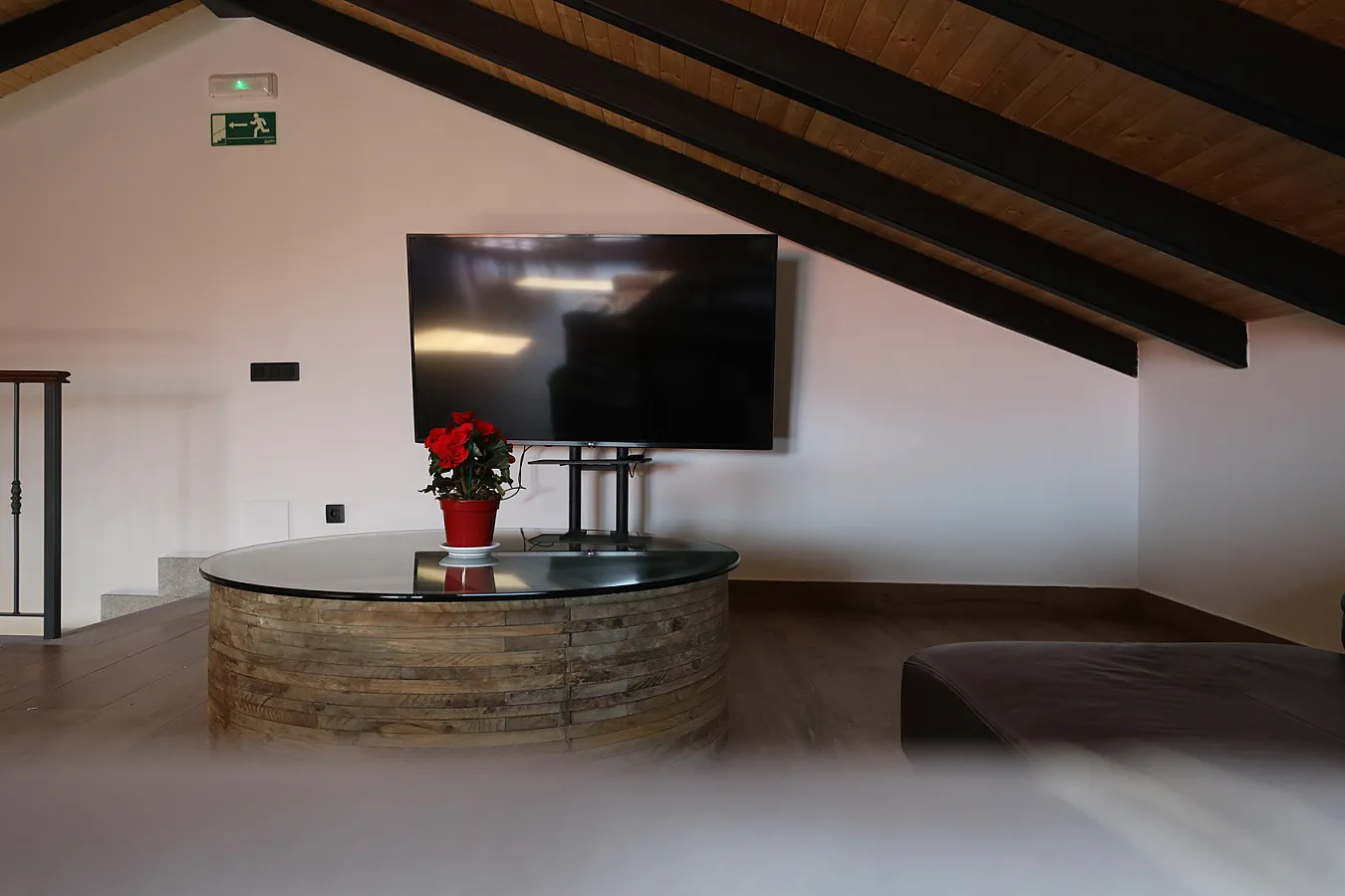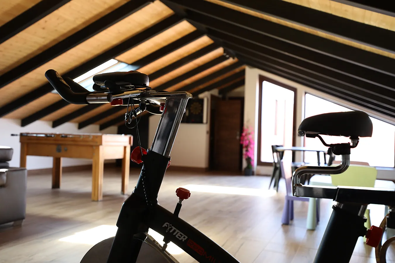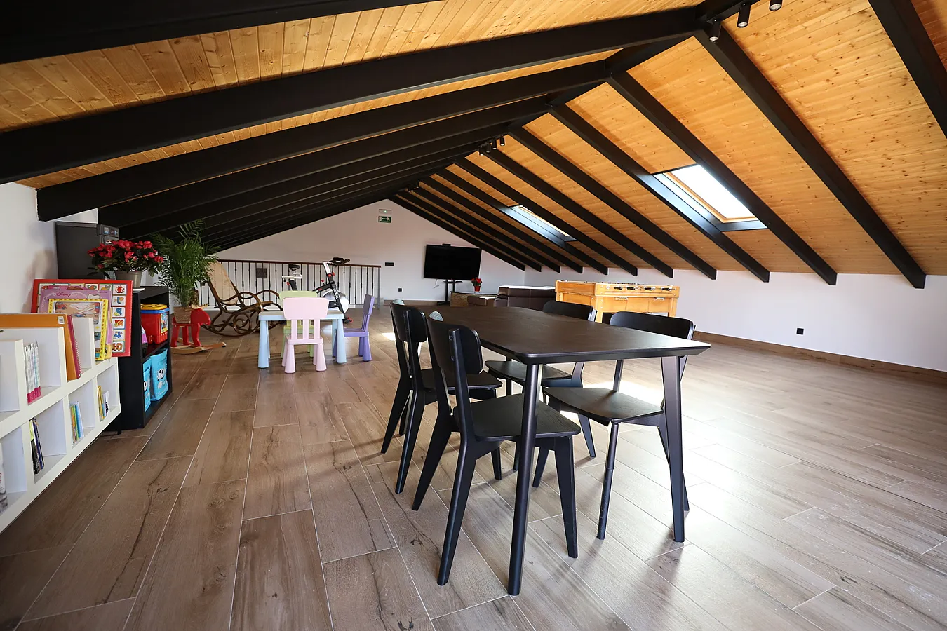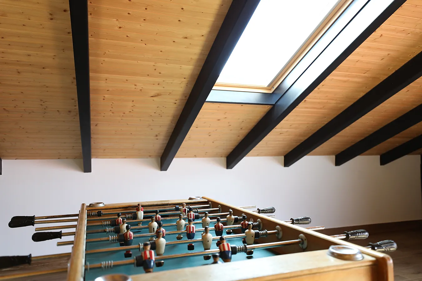 La buhardilla se ha convertido en un espacio multifuncional para actividades deportivas, zona de televisión y juegos, con futbolín y diana, ideal tanto para adultos como para niños.