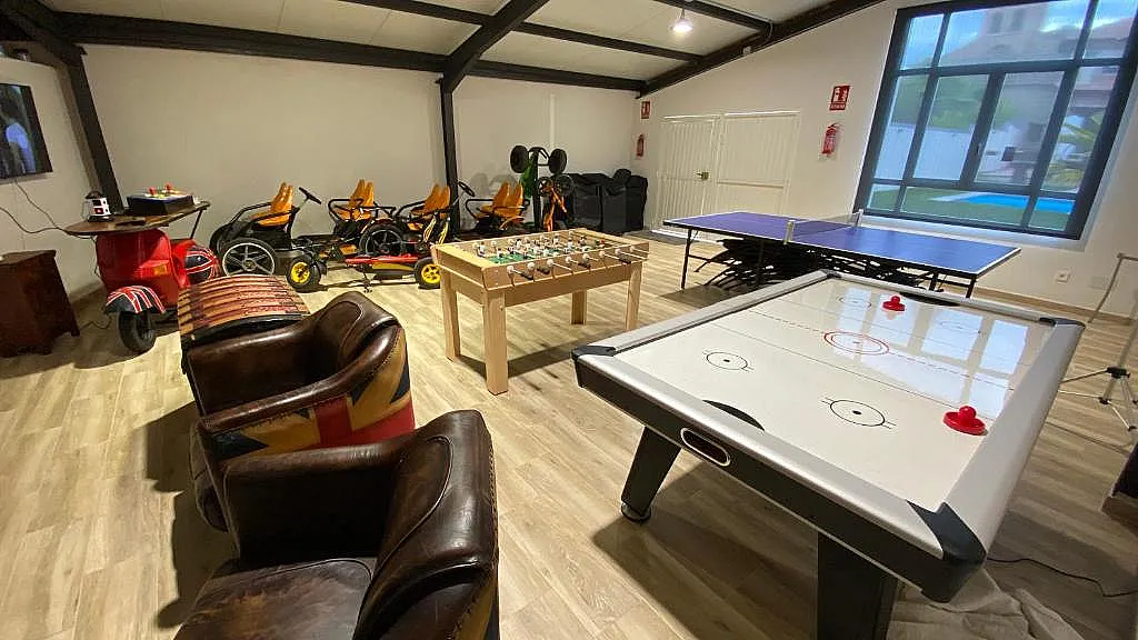 Entre sus espacios comunes y de ocio destaca el salón con chimenea, la sala de juegos con ping-pong, futbolín, hockey, karaoke, consola y juegos de mesa, una parte importante de la propuesta para grupos grandes.