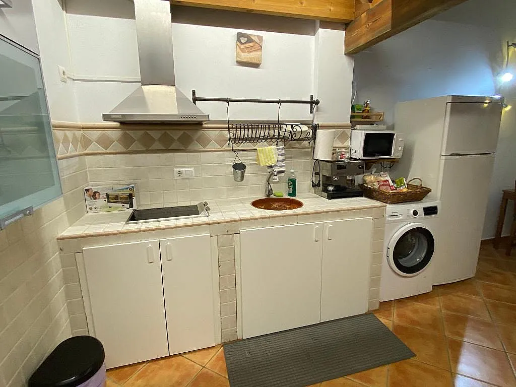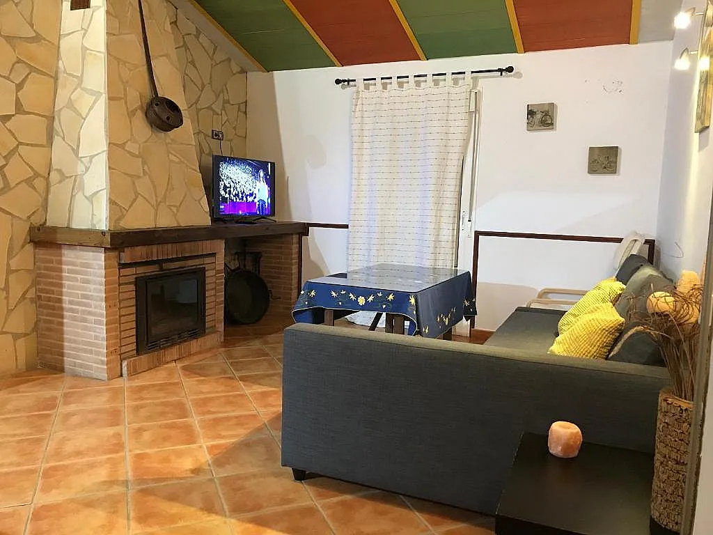 El alojamiento está concebido como un loft rural con una distribución abierta y funcional. Se encuentran la cocina con barra americana, el comedor y el salón con chimenea, además de una ventana a la calle que aporta luz natural y una relación más directa con el ambiente del pueblo. También cuenta con 2 sofás cama.