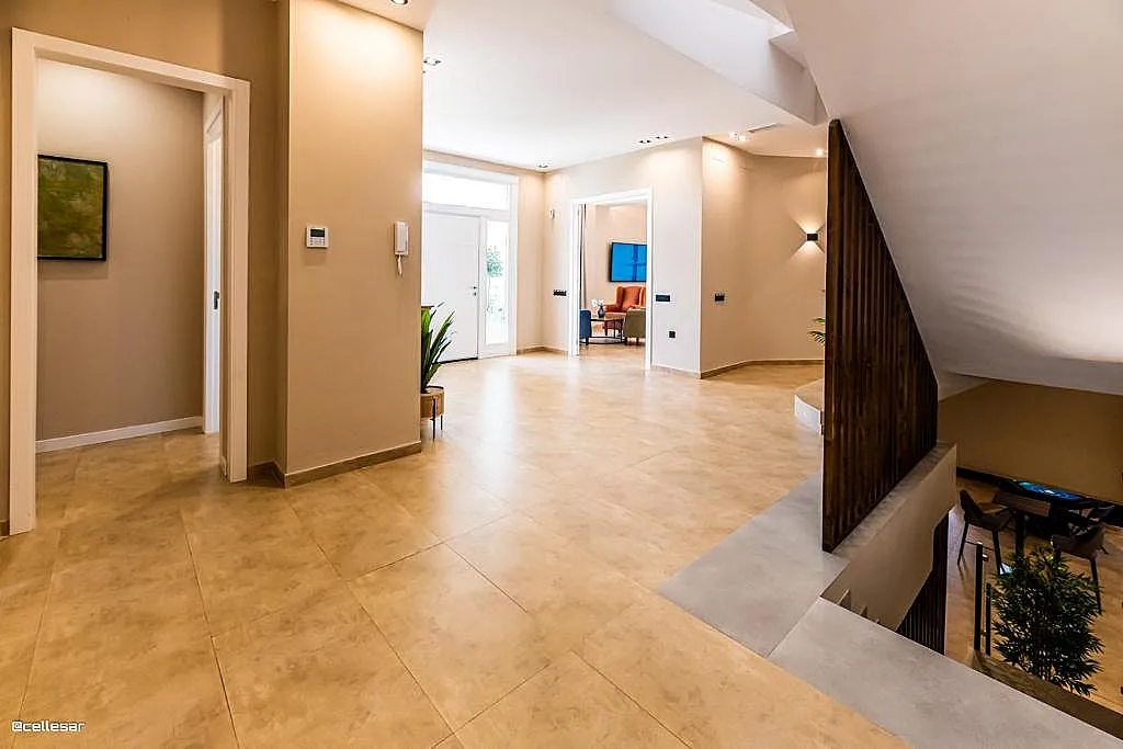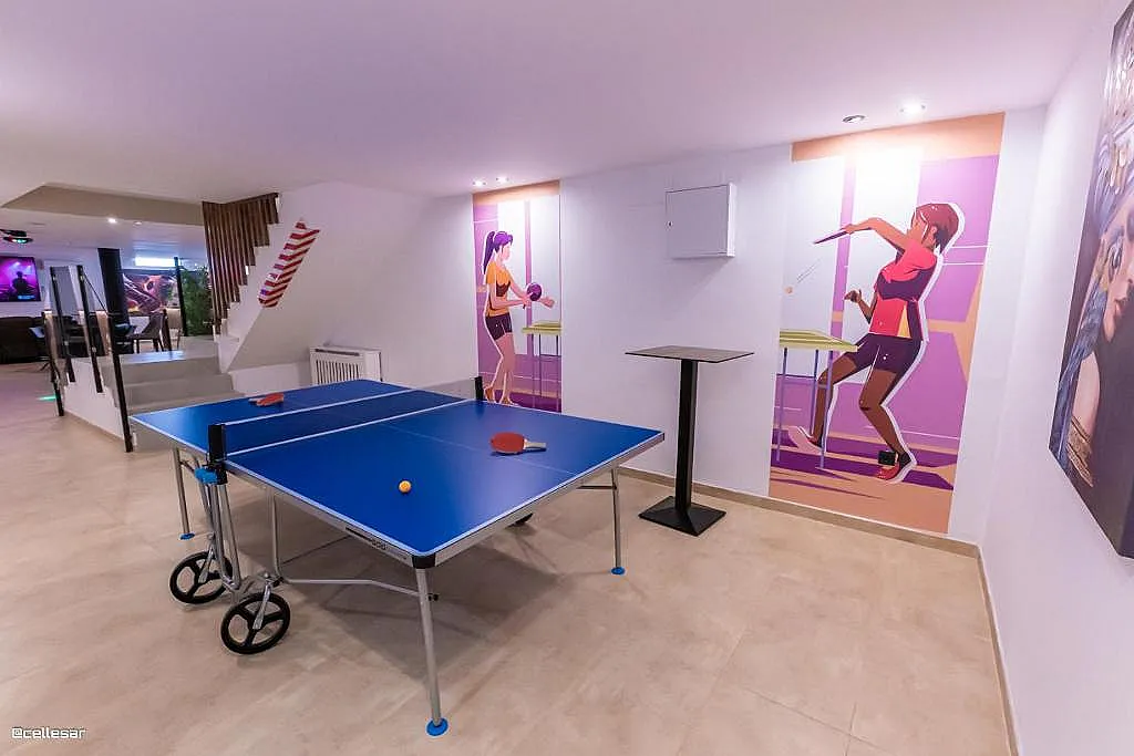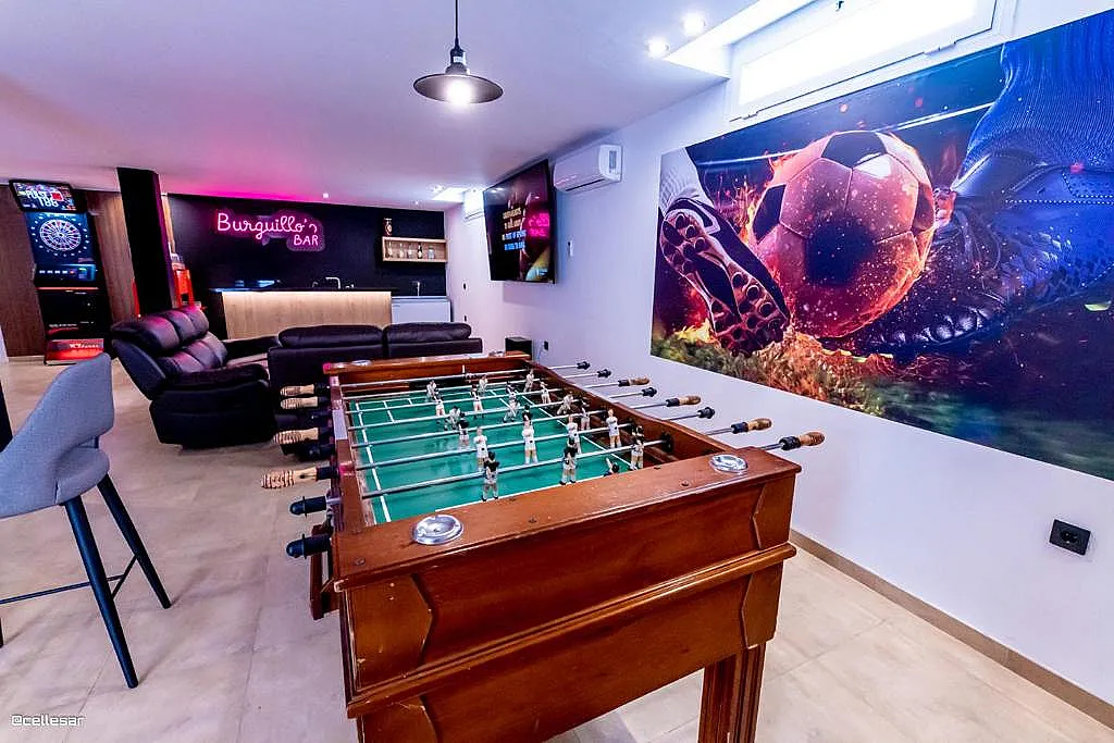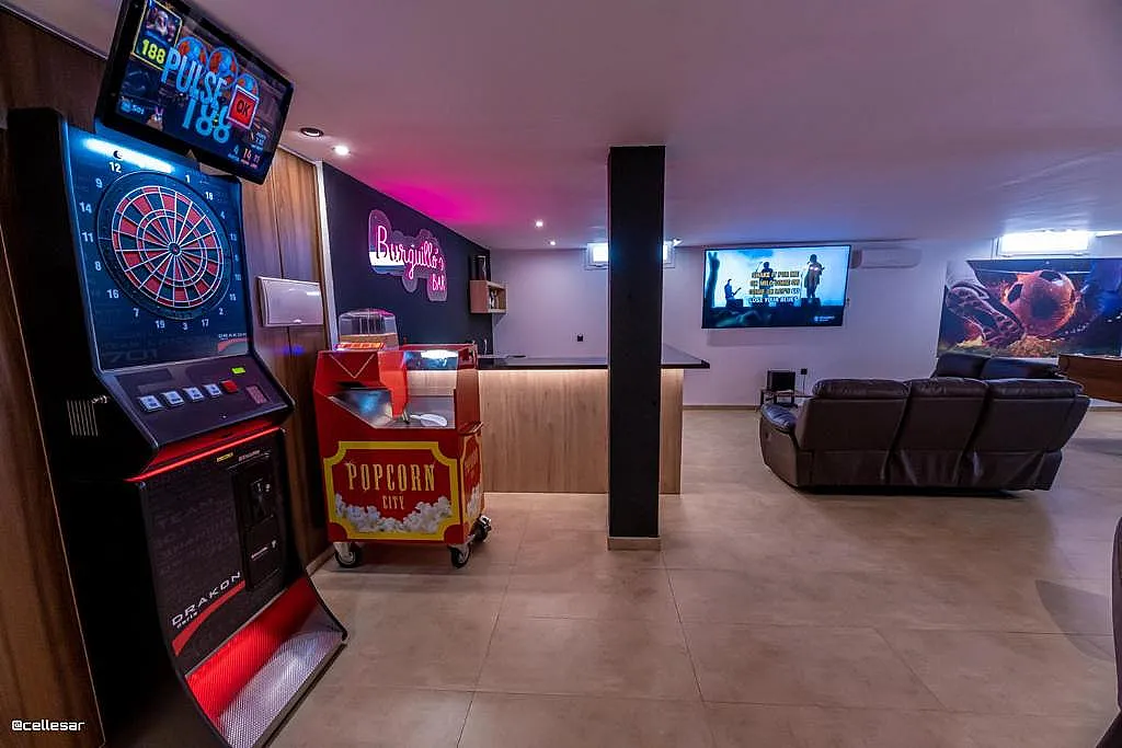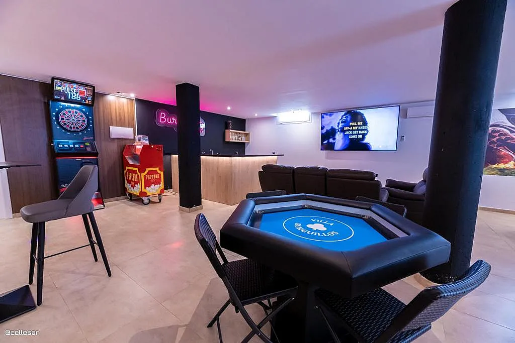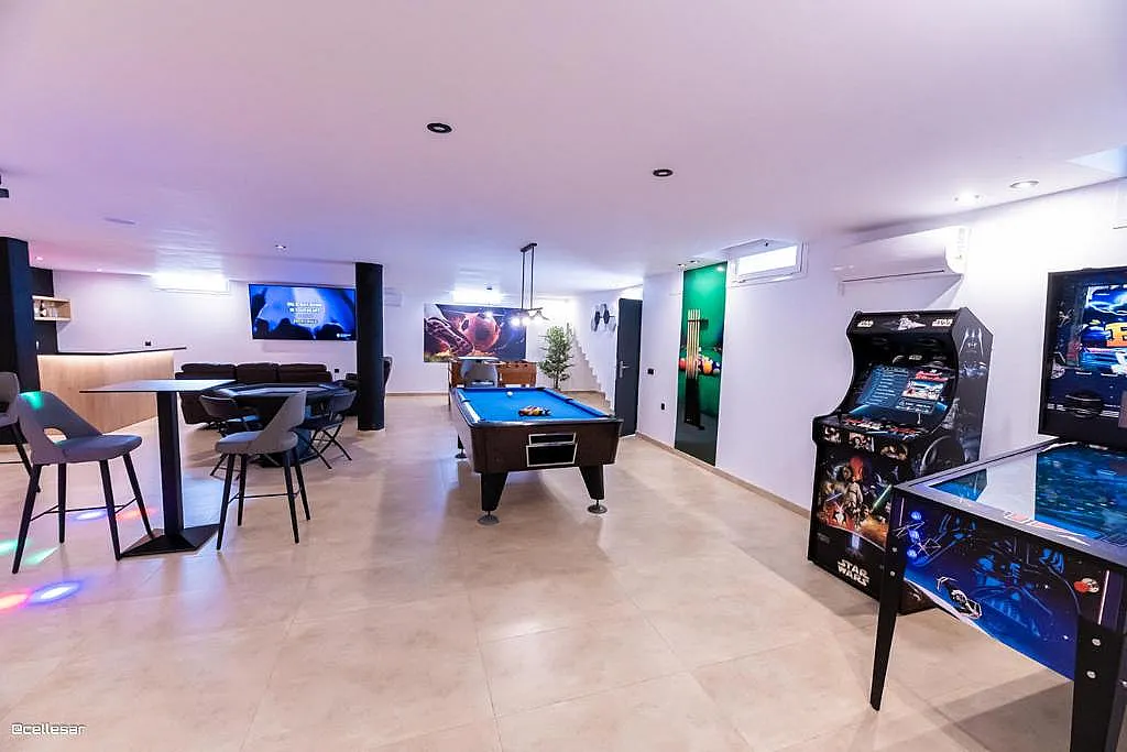 La casa se distribuye en varias plantas. En la planta baja se encuentran la cocina con acceso a una terraza con vistas a la piscina, el salón-comedor, 3 dormitorios y 2 baños. En la planta superior se ubican los dormitorios restantes. El sótano está dedicado íntegramente al ocio: cine, mesa de ping-pong, zona gaming, bar, karaoke, futbolín, jacuzzi para 12 personas y baño turco.