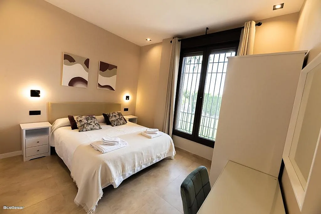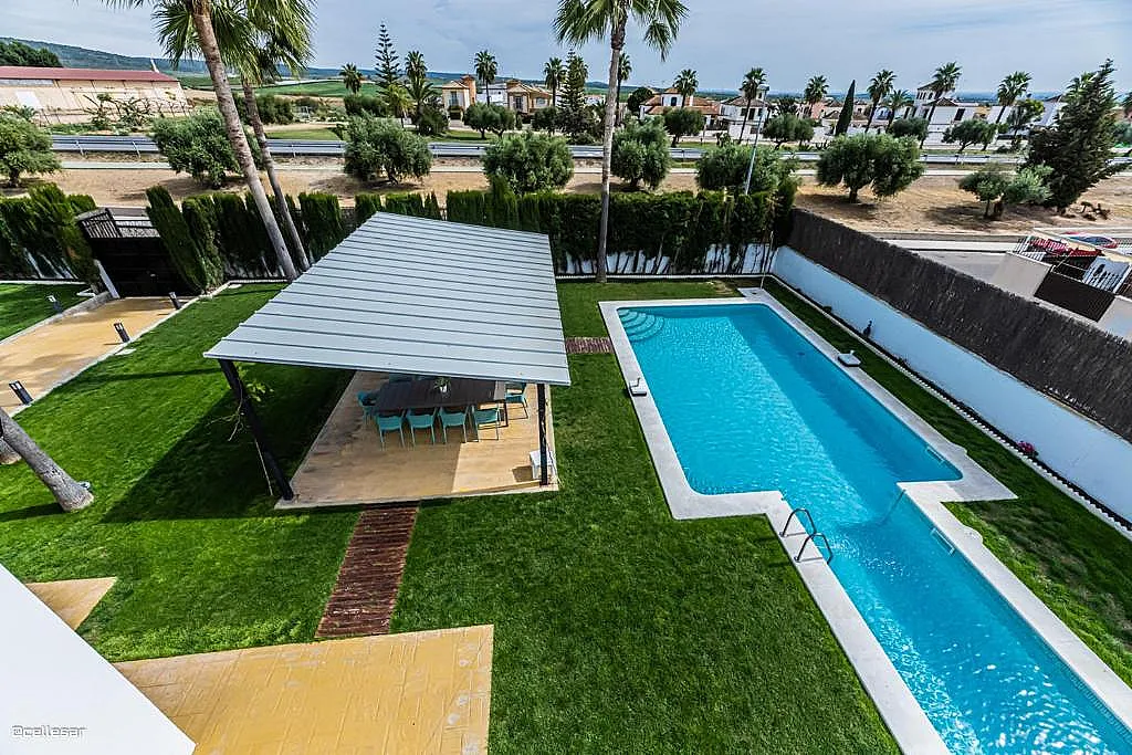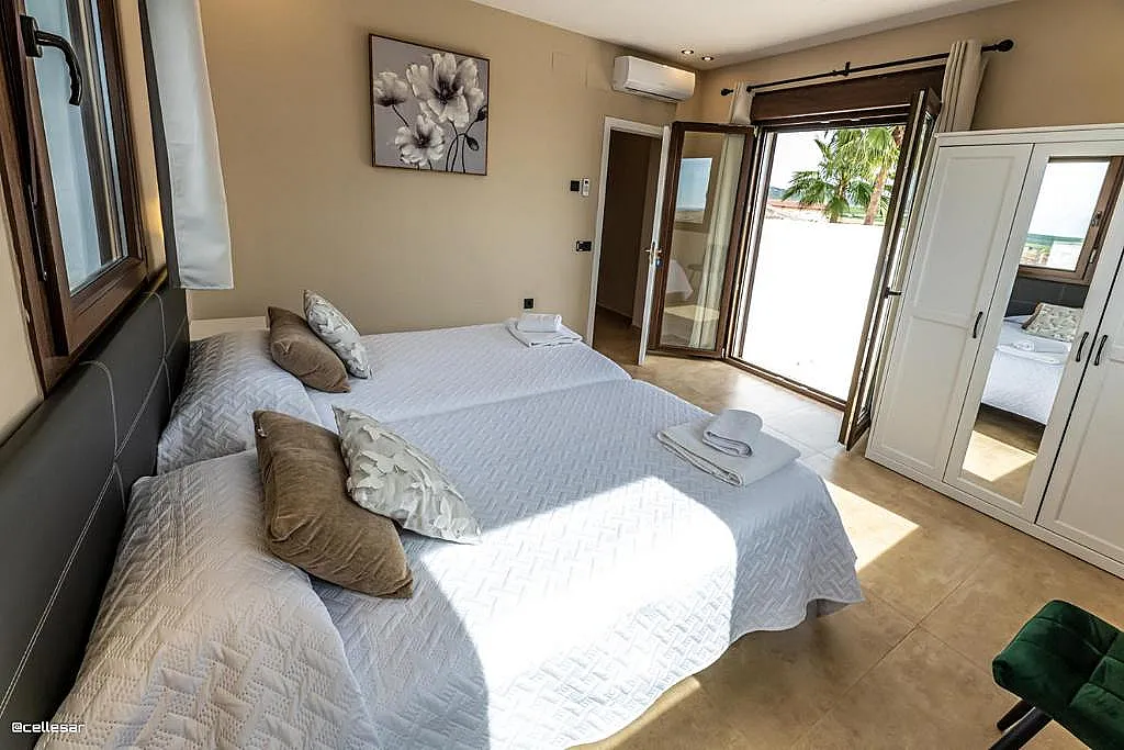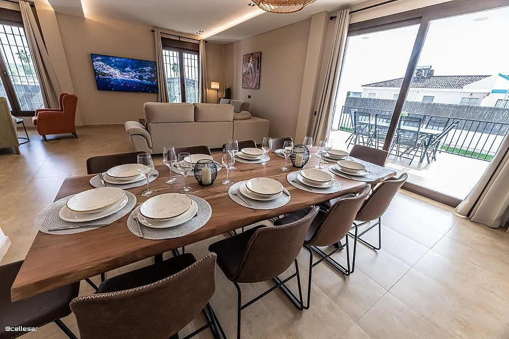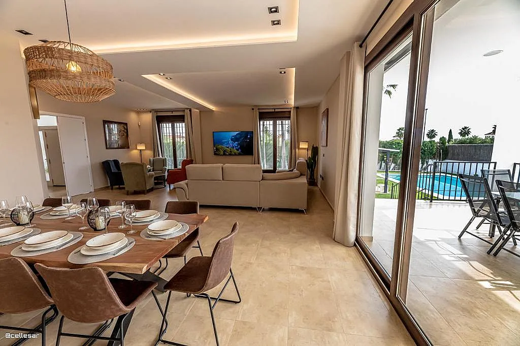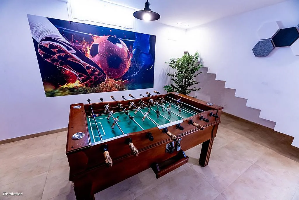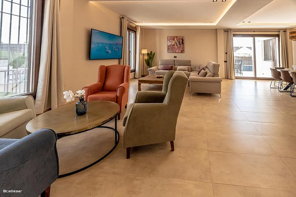 La casa se distribuye en varias plantas. En la planta baja se encuentran la cocina con acceso a una terraza con vistas a la piscina, el salón-comedor, 3 dormitorios y 2 baños. En la planta superior se ubican los dormitorios restantes. El sótano está dedicado íntegramente al ocio: cine, mesa de ping-pong, zona gaming, bar, karaoke, futbolín, jacuzzi para 12 personas y baño turco.