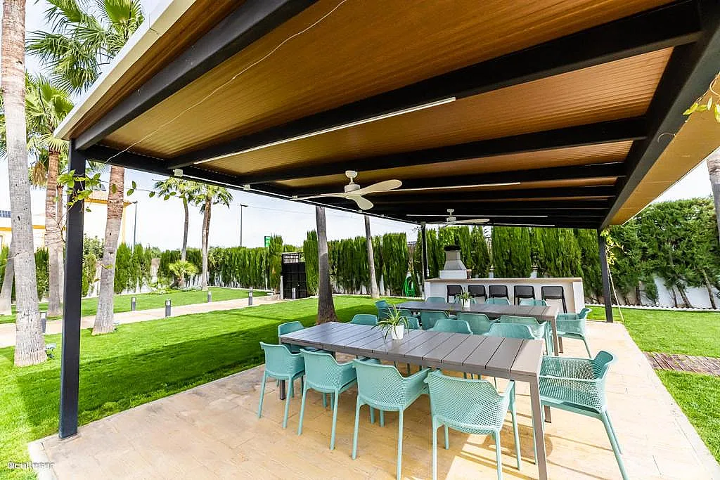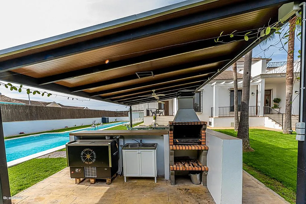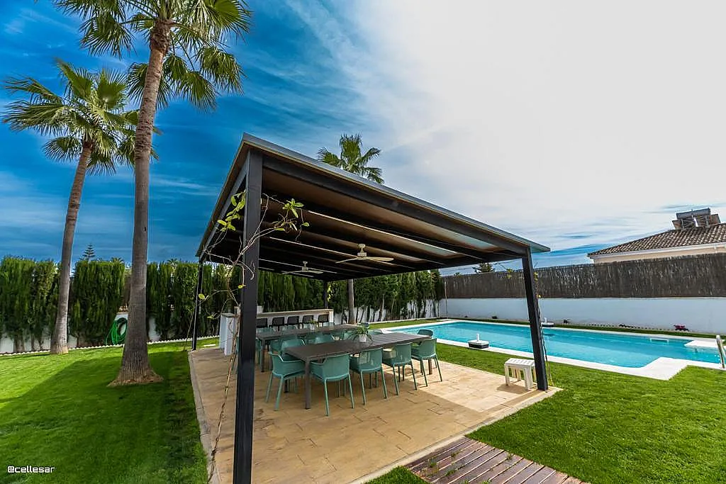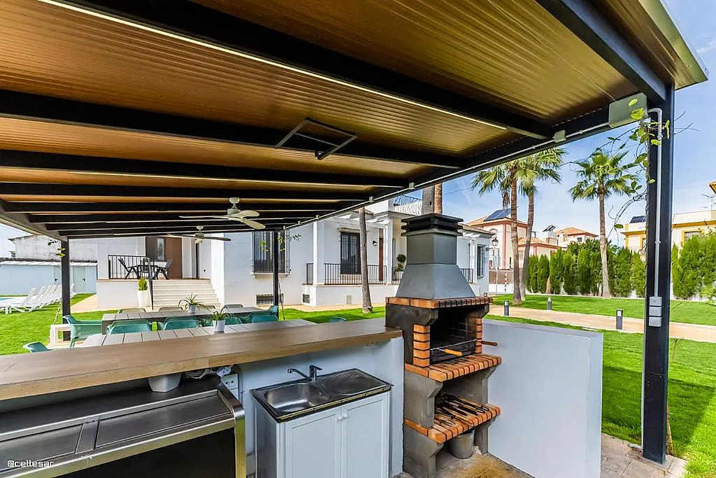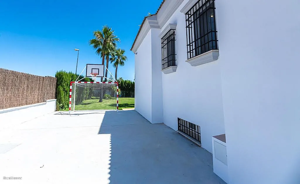 En el exterior, la villa dispone de una zona de barbacoa cubierta con espacio para comer al aire libre, equipada con ventiladores para los días más cálidos. Además, cuenta con una piscina con solárium y una cancha de baloncesto que añade opciones de actividad física durante la estancia.