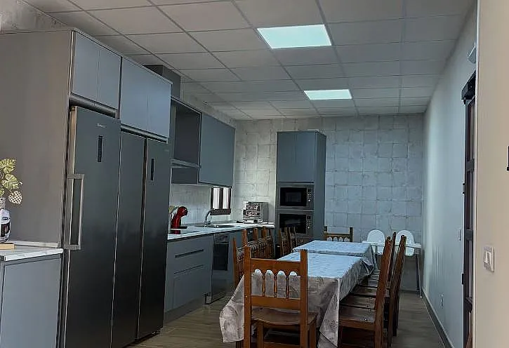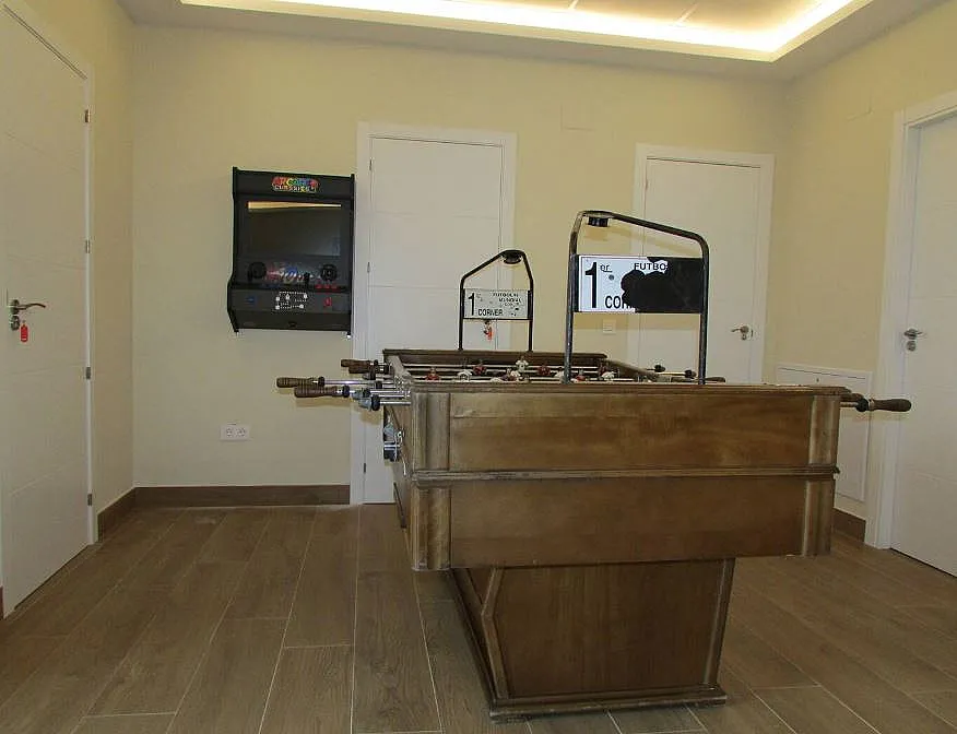 En el corazón de la casa destaca su salón-comedor de 60 m², preparado para acoger a grupos numerosos con sofás, televisión y mesas con capacidad para 20 comensales. El ocio también está presente con una zona de juegos equipada con futbolín y máquina arcade.
