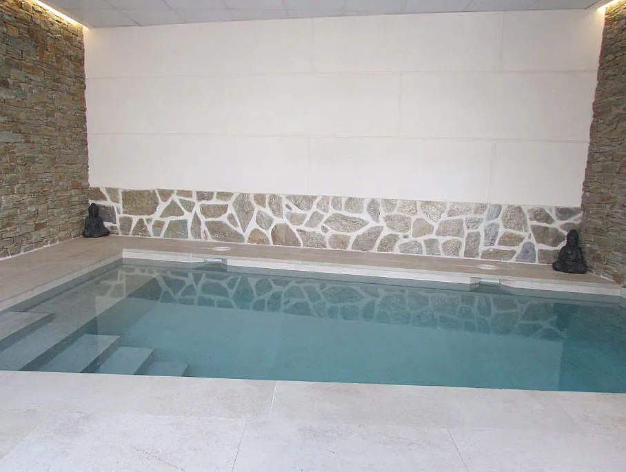 Los espacios exteriores están diseñados para disfrutar durante todo el año. La piscina cubierta y climatizada es uno de los grandes atractivos, acompañada de una zona con mesas y sillas, mientras que en el patio se encuentra la barbacoa. El solárium, con césped artificial, ducha y hamacas, completa un espacio ideal para el descanso.