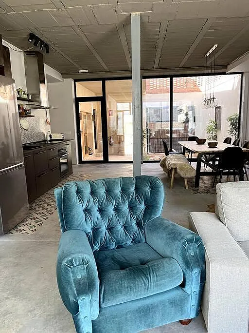 El exterior se organiza en tres espacios independientes: un patio de recepción, el jardín principal con piscina, barbacoa, mesa para 12 comensales y sofás exteriores, y la gran terraza de la planta superior con sillas colgantes para disfrutar del cielo nocturno.