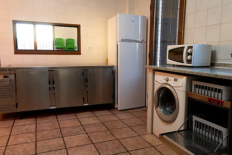 El edificio, de construcción reciente, dispone de 4 dormitorios con baño individual y 3 habitaciones adicionales, además de cocina con despensa y menaje, comedor, sala de estar y sótano. También cuenta con baños exteriores con duchas, lo que permite una gran capacidad de uso simultáneo.