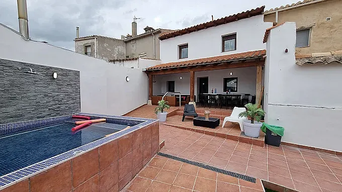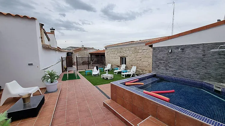 El alojamiento destaca por su funcionalidad y amplitud. Dispone de 4 baños, un porche dividido en dos zonas diferenciadas, una pequeña piscina con zona de playa equipada con hamacas y mesas, y un merendero independiente de 50 m² con cocina, baño y zona de comedor con televisión.