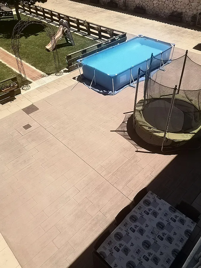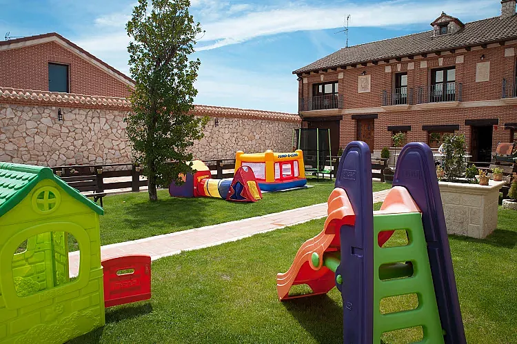 La atención al detalle se extiende también al equipamiento infantil: cuatro cunas, tronas, hamacas y monitor de vigilancia para bebés forman parte del conjunto. En el exterior, el patio cerrado es ideal para celebraciones y juegos sin preocupaciones. Hay piscina infantil, columpios, cama elástica, hinchable y una terraza decorada con elementos tradicionales, equipada con mobiliario y televisión.