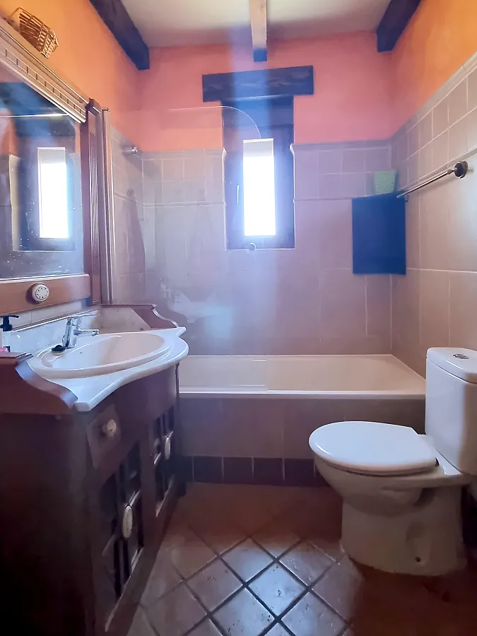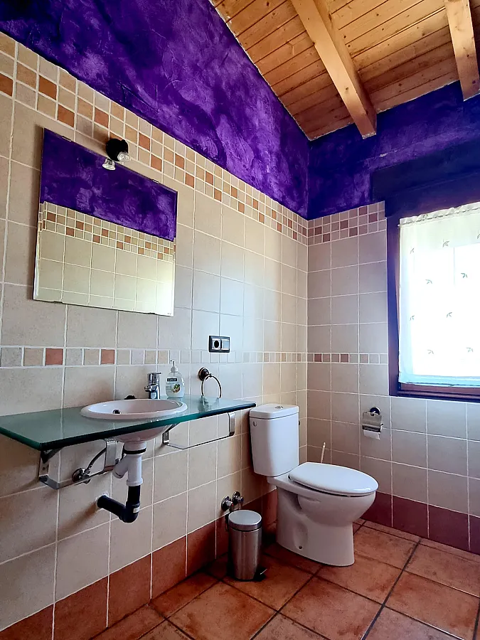 Cada estancia está equipada con baño completo (cinco individuales y uno compartido), y el sistema de climatización mediante bombas de calor garantiza una temperatura adecuada durante todo el año. La casa cuenta con dos amplios salones de más de 26 m², uno con chimenea y zona de televisión, y otro con barra de bar, ideal para celebraciones o como zona de juegos para los más pequeños.