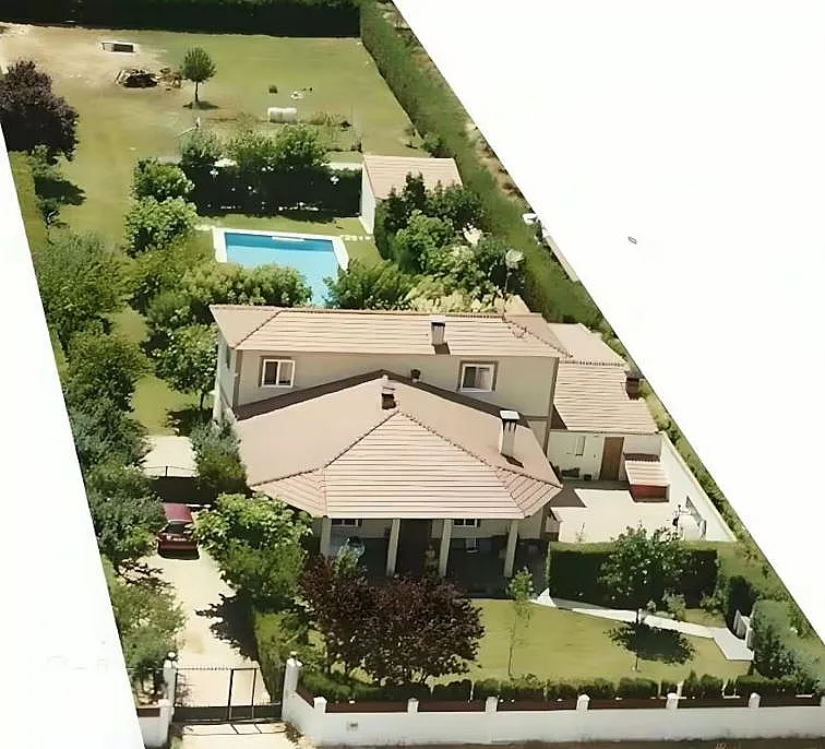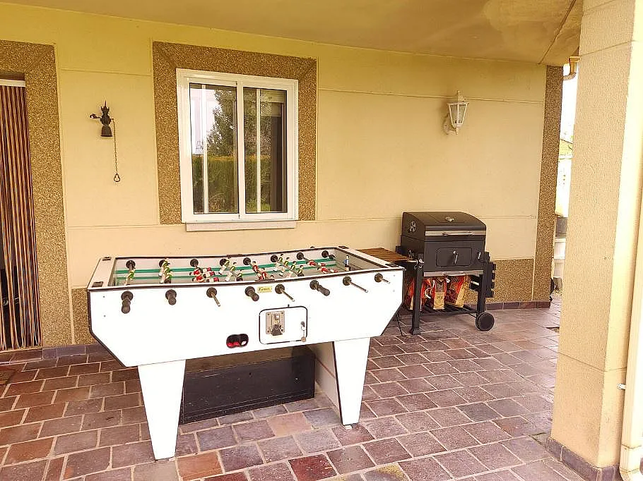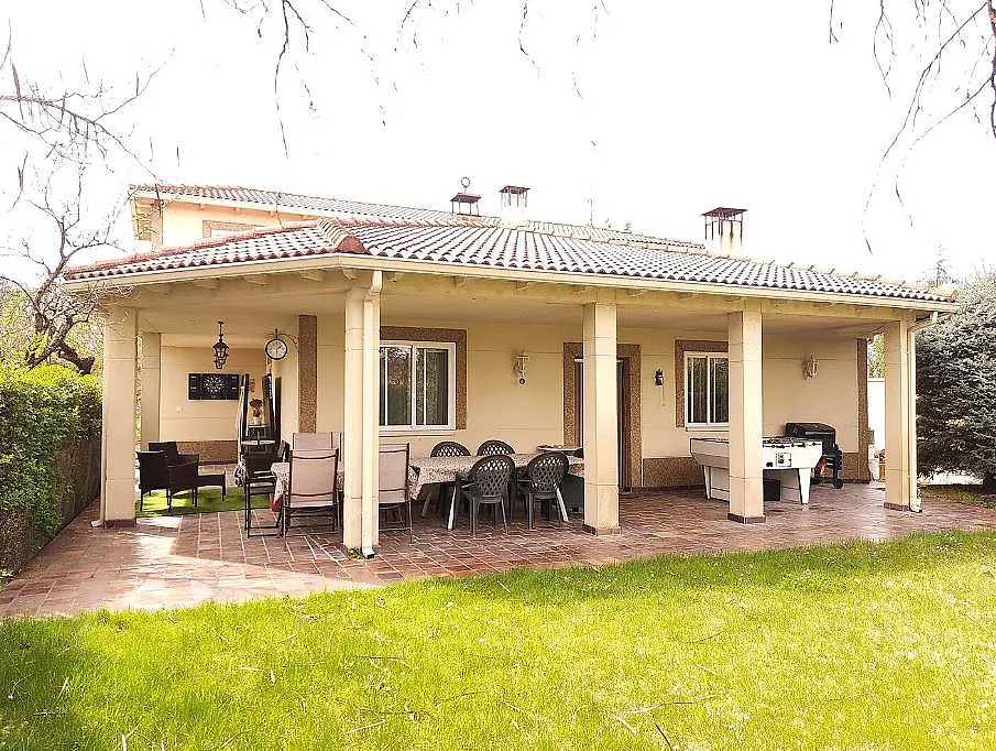 El porche en forma de L ofrece dos zonas diferenciadas: una con mobiliario y barbacoa, y otra con espacio de juegos. El jardín cuenta con una piscina en el centro, perfecta para disfrutar del buen tiempo.