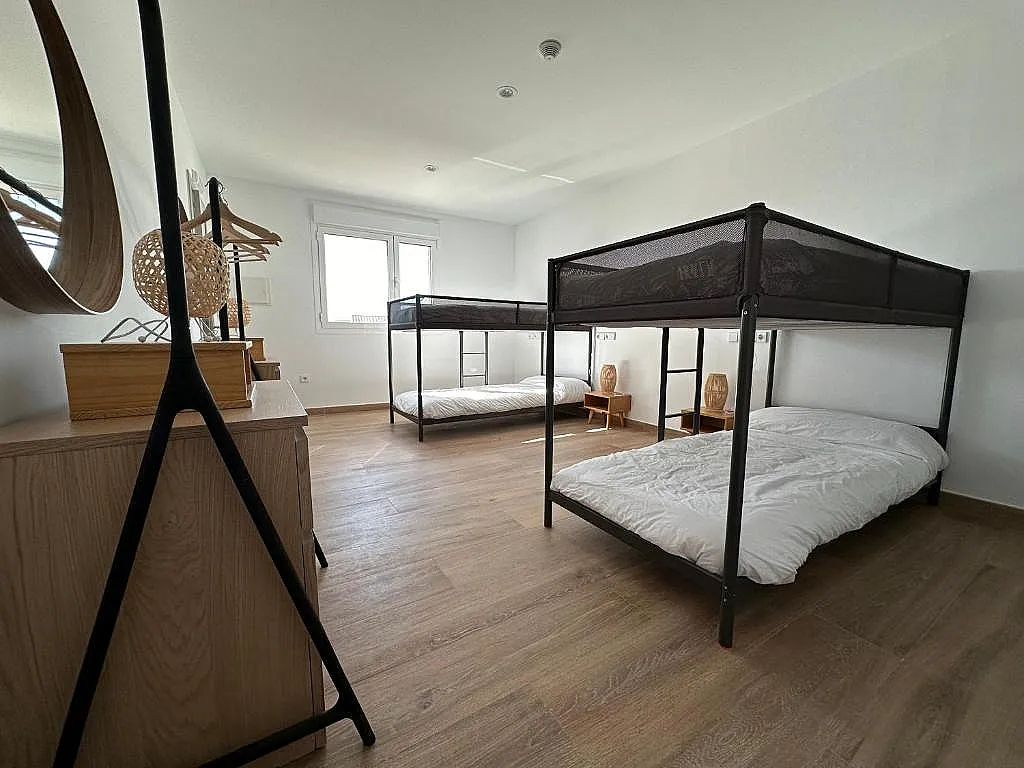 En la primera planta hay otro salón-cocina con salida a terraza, que solo se abre cuando todas las habitaciones son reservadas por el mismo cliente, además de 3 dormitorios más con distintas configuraciones de camas y baños exclusivos o incorporados.